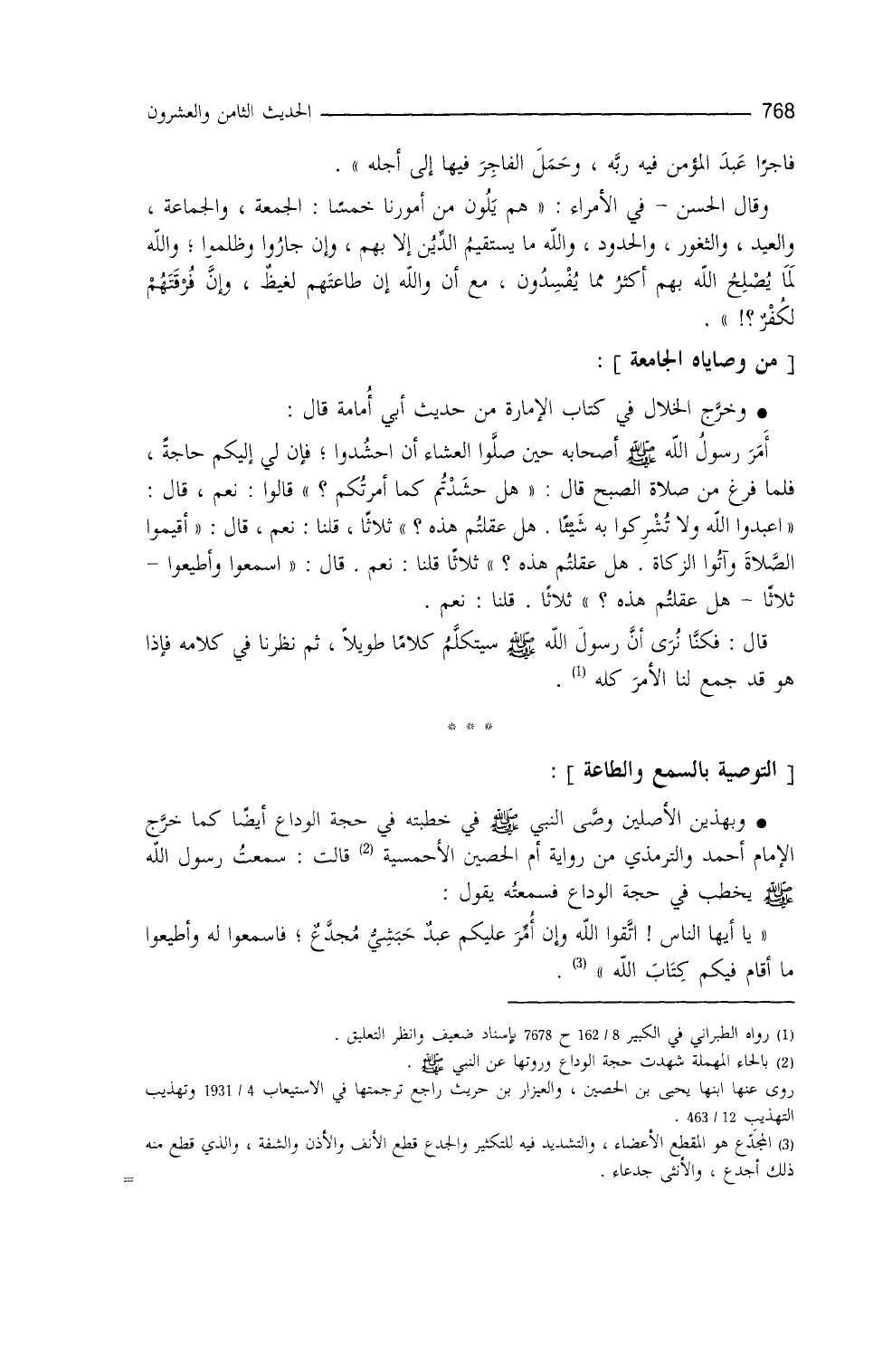 وبهذين الأصلين وصَّى النَّبيُّ - صلى الله عليه وسلم - في خطبته في حجة الوداع أيضاً، كما خرَّج الإمامُ أحمد والترمذي من رواية أمِّ الحصين الأحمسية، قالت: سمعتُ رسول الله - صلى الله عليه وسلم - يخطُبُ في حَجّةِ الوداع، فسمعتُه يقول: ((يا أيُّها النَّاسُ، اتَّقوا الله، وإنْ أُمِّرَ عليكم عبدٌ حبشيٌّ مجدَّعٌ، فاسمعوا له وأطيعوا ما أقام فيكم كتاب الله)) (¬3) .
