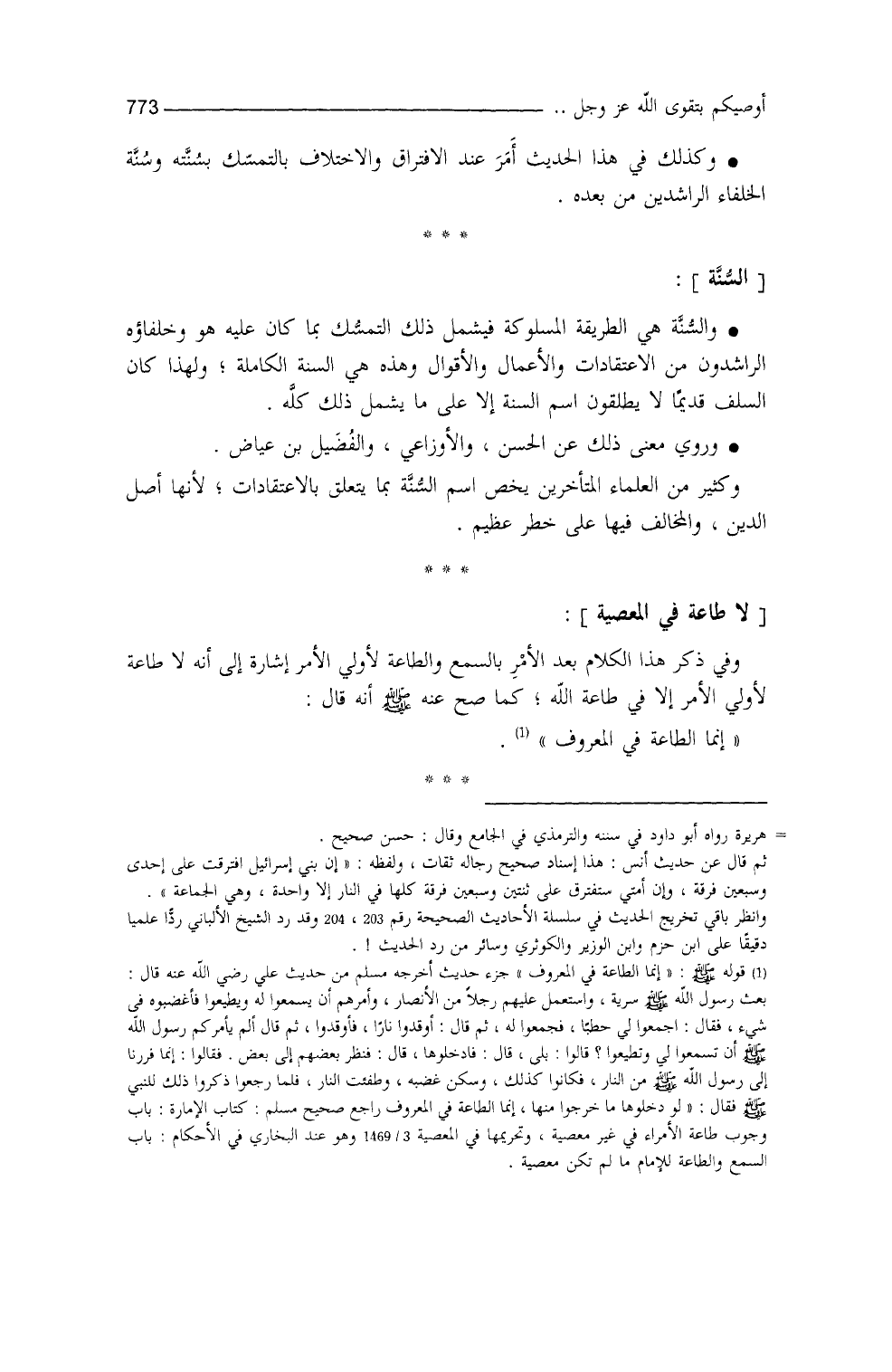 وكثيرٌ من العُلماء المتأخرين يخصُّ اسم السُّنة بما يتعلق بالاعتقادات؛ لأنَّها أصلُ الدِّين، والمخالفُ فيها على خطرٍ عظيم، وفي ذكر هذا الكلام بعد الأمر بالسَّمع والطَّاعة لأُولي الأمر إشارةٌ إلى أنَّه لا طاعةَ لأولي الأمر إلاّ في طاعة اللهِ، كما صحَّ عنه أنَّه قال: ((إنَّما الطَّاعةُ في المعروف)) (¬1) .