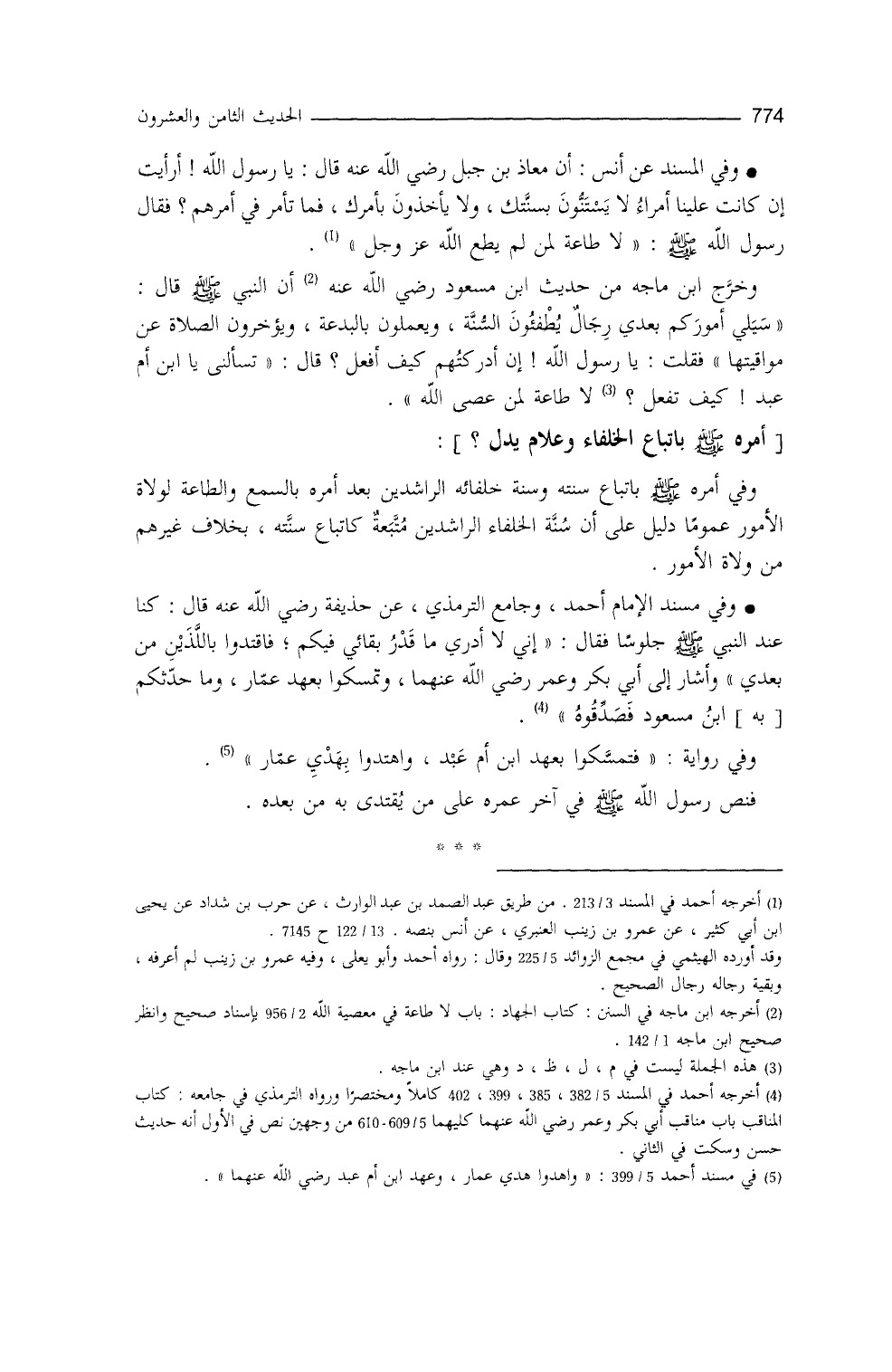 وفي " مسند الإمام أحمد " (¬3) و" جامع الترمذي " (¬4) عن حُذيفة قال: كنَّا عند النَّبيِّ - صلى الله عليه وسلم - جُلوساً، فقال: ((إني لا أدري ما قَدْرُ بقائي فيكم، فاقتدوا باللَّذيْنِ من بعدي - وأشار إلى أبي بكر وعمر - وتمسَّكوا بعهدِ عمَّار، وما حدَّثكم ابنُ مسعودٍ، فصدقوه)) ، وفي روايةٍ: ((تمسَّكوا بعهد ابنِ أم عبدٍ، واهتدوا بهدي عمار)) . فنصَّ - صلى الله عليه وسلم - في آخر عمره على من يُقتدى به مِنْ بعده،