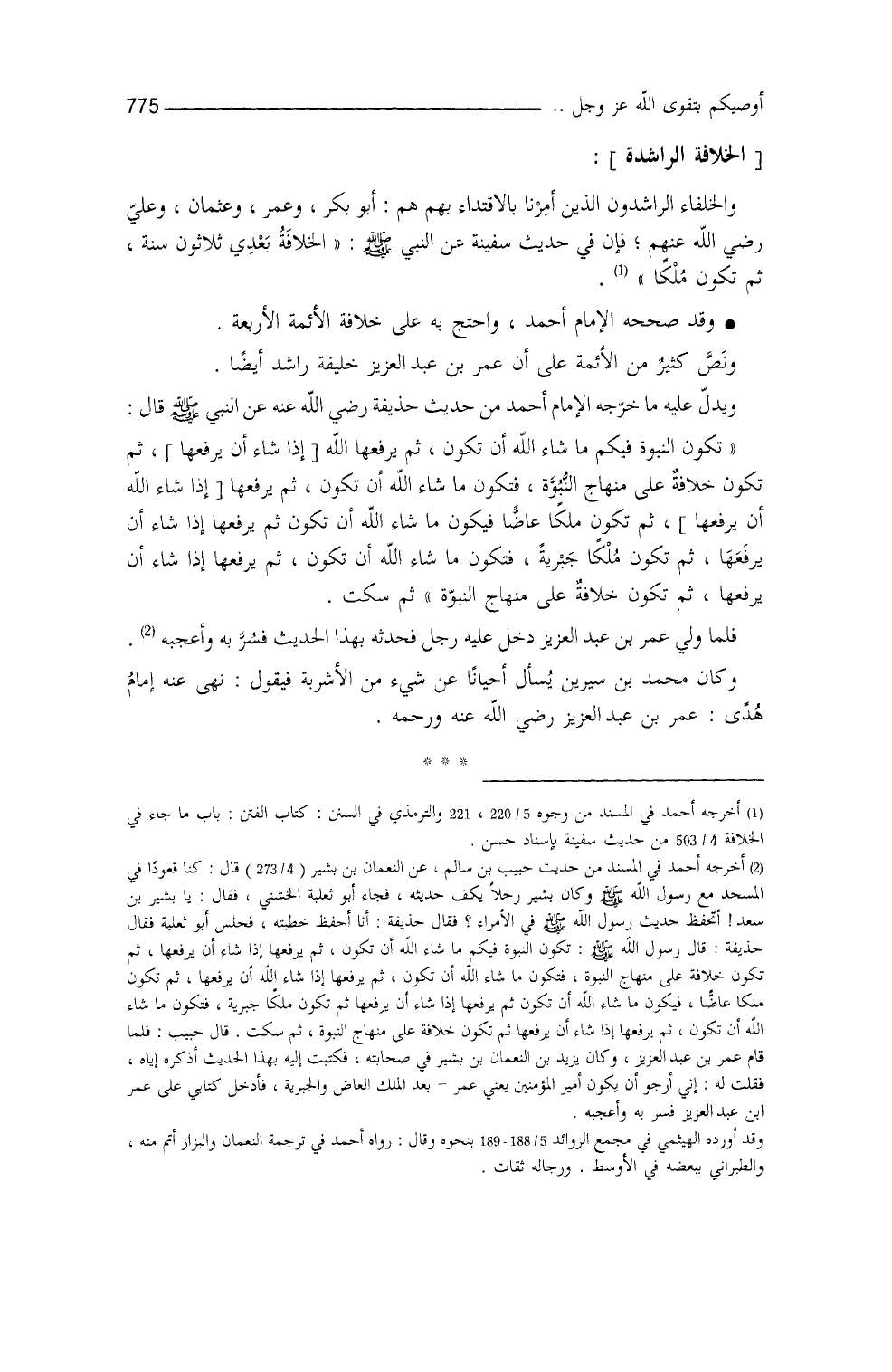 ونصَّ كثيرٌ من الأئمَّة على أنَّ عمر بنَ عبد العزيز خليفةٌ راشد أيضاً، ويدلُّ عليه ما خرَّجه الإمام أحمد (¬3) من حديث حُذيفة، عن النَّبيِّ - صلى الله عليه وسلم -، قال: ((تكونُ فيكم النبوَّةُ ما شاء الله أنْ تكون، ثم يرفعها الله إذا شاء أنْ يرفعها، ثم تكون خلافةٌ على منهاج النبوَّة، فتكونُ ما شاءَ الله أنْ تكونَ، ثم يرفعُها الله إذا شاء أنْ يرفعها، ثمَّ تكونُ مُلكاً عاضَّاً ما شاء الله أنْ تكون، ثم يرفعها إذا شاء أنْ يرفعها، ثم تكونُ مُلكاً جبرية، فتكون ما شاء الله أنْ تكون، ثم يرفعها إذا شاء أنْ يرفعها، ثم تكون خلافةً على منهاج النبوَّة)) ثُمَّ سكت. فلما ولي عمر بن عبد العزيز، دخل عليه رجلٌ، فحدَّثه بهذا الحديث، فسُرَّ به، وأعجبه.