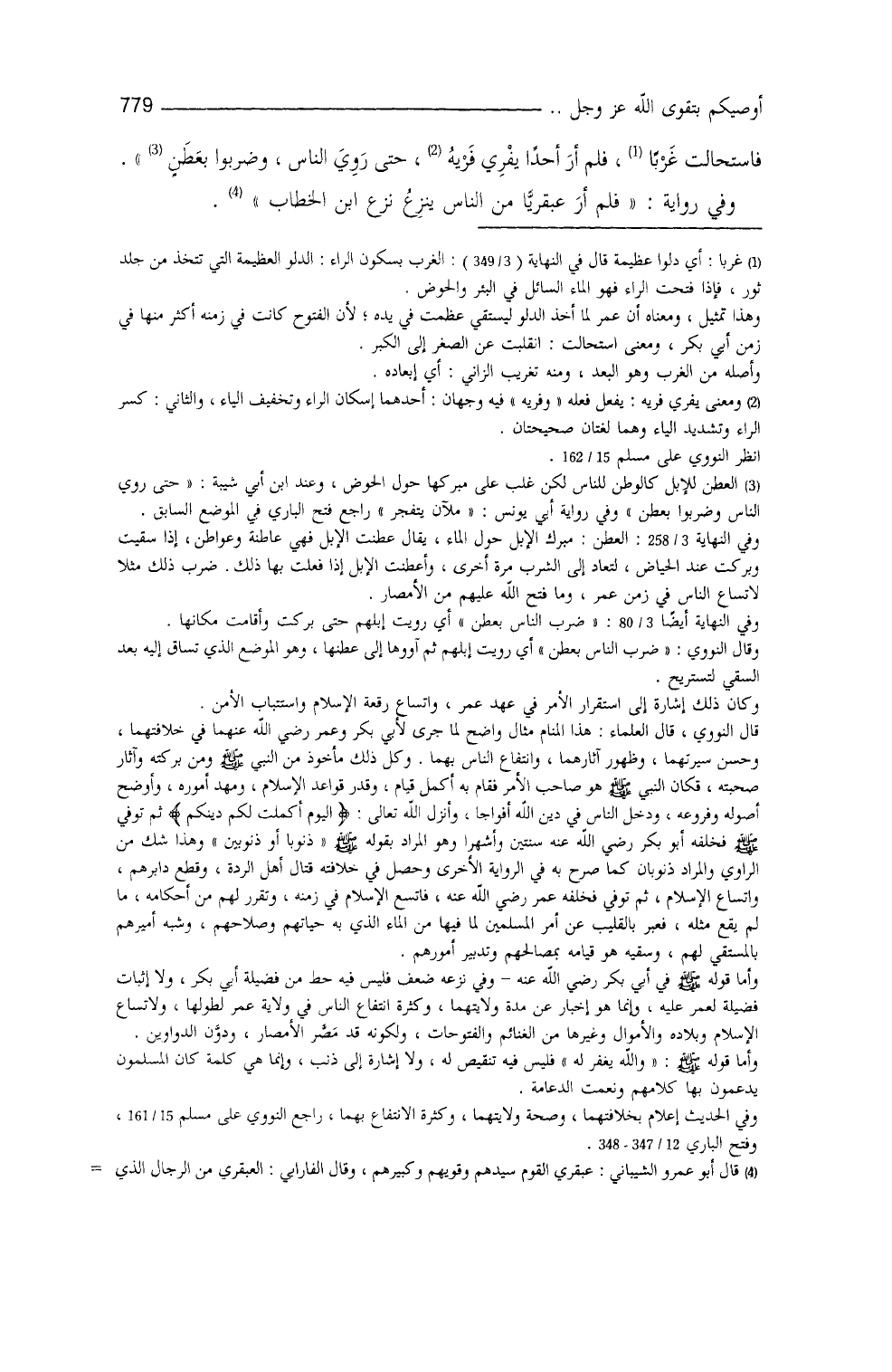 فاستحالت غَرْباً، فلم أرَ أحداً يفري فَرْيَهُ حتَّى رَوِيَ النَّاس، وضربوا بعَطَنٍ)) ، وفي روايةٍ: ((فلم أرَ عبقرياً من النَّاسِ يَنْزِعُ نزعَ ابنِ الخطاب))