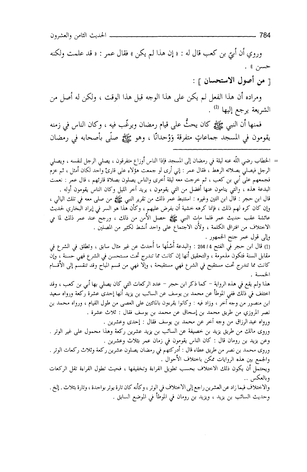 وروي أنَّ أبيَّ بن كعب، قال له: إنَّ هذا لم يكن، فقال عمرُ: قد علمتُ، ولكنَّه حسنٌ. ومرادُه أنَّ هذا الفعلَ لم يكن على هذا الوجه قبل هذا الوقت، ولكن له أصولٌ منَ الشَّريعةِ يُرجع إليها، فمنها: أنَّ النَّبيَّ - صلى الله عليه وسلم - كان يحُثُّ على قيام رمضان، ويُرَغِّبُ فيه، وكان النَّاس في زمنه يقومون في المسجد جماعاتٍ متفرِّقةً ووحداناً، وهو - صلى الله عليه وسلم - صلَّى بأصحابه في رمضانَ
