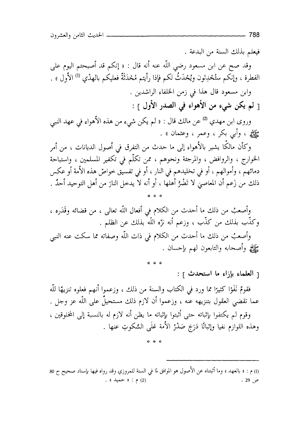 وروى ابن مهدي، عن مالك قال: لم يكن شيءٌ من هذه الأهواء في عهد النَّبيِّ - صلى الله عليه وسلم - وأبي بكر وعمر وعثمان (¬2) . وكأنَّ مالكاً يُشير بالأهواء إلى ما حدث من التفرُّق في أُصول الديانات من أمر الخوارج والروافض والمرجئة ونحوهم ممَّن تكلَّم في تكفير المسلمين، واستباحة دمائهم وأموالهم، أو في تخليدهم في النار، أو في تفسيق خواصِّ هذه الأمة، أو عكس ذلك، فزعم أنَّ المعاصي لا تضرُّ أهلَها، أو أنَّه لا يدخلُ النَّار مِنْ أهل التوحيدِ أحدٌ.