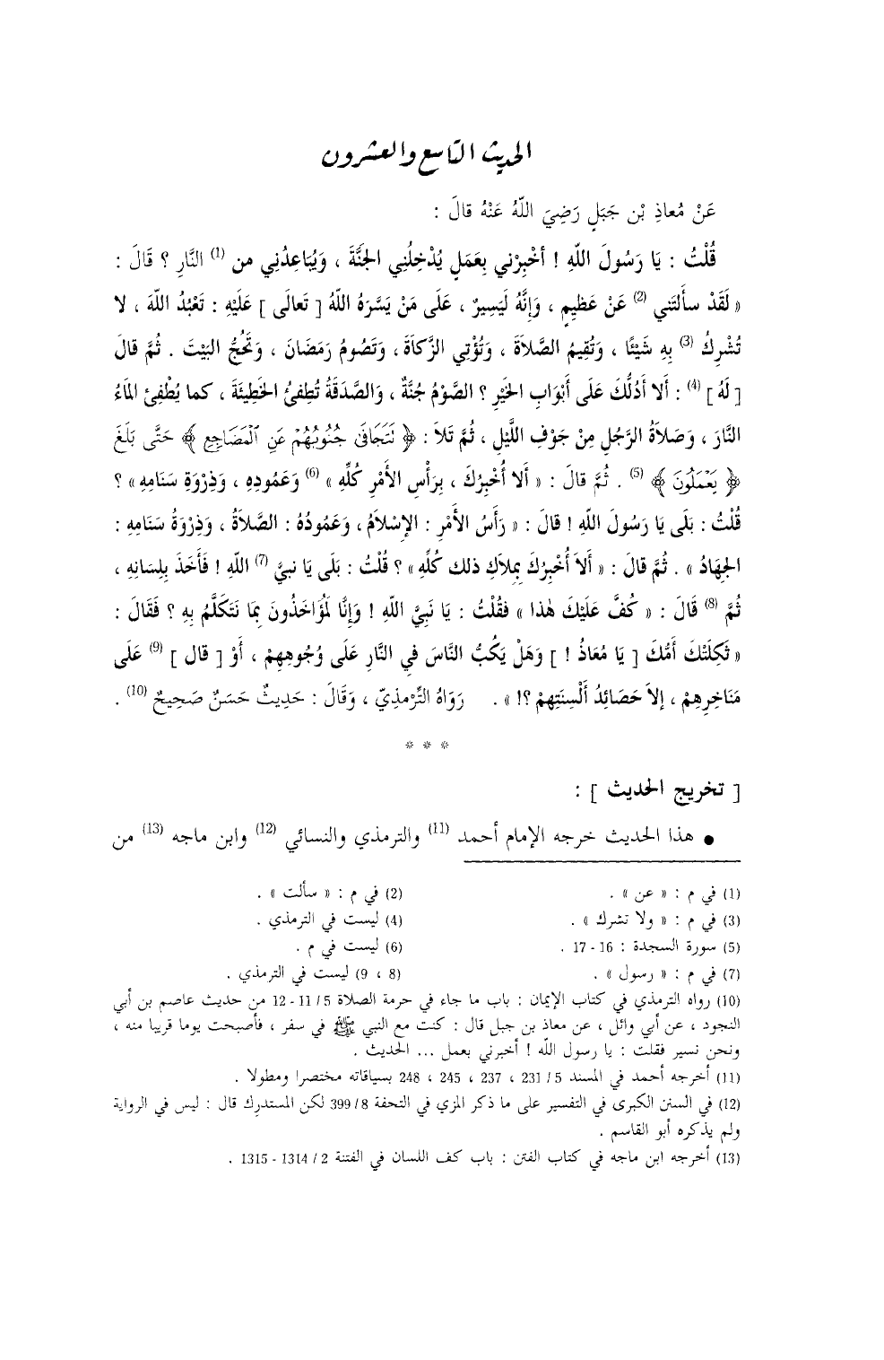 عَنْ مُعاذٍ - رضي الله عنه - قال: قُلتُ: يا رَسولَ الله أَخبِرني بِعَمَلٍ يُدخِلُني الجَنَّةَ ويُباعِدُني مِنَ النَّارِ، قال: ((لقَدْ سَأَلْتَ عَنْ عَظيمٍ وإنَّهُ لَيَسيرٌ عَلَى مَنْ يَسَّرَهُ الله عليه: تَعْبُدُ الله لا تُشْرِكُ بهِ شيئاً، وتُقيمُ الصَّلاةَ، وتُؤتِي الزَّكاةَ، وتَصُومُ رَمضَانَ، وتَحُجُّ البَيتَ)) . ثمَّ قالَ: ((ألا أَدُلُّكَ على أبوابِ الخير؟ الصَّومُ جُنَّةٌ، والصَّدقَةُ تُطْفِئُ الخَطيئَةَ كَما يُطفئُ الماءُ النارَ، وصَلاةُ الرَّجُلِ مِنْ جَوفِ اللَّيلِ، ثمَّ تلا: {تَتَجَافَى جُنُوبُهُمْ عَنِ الْمَضَاجِعِ} حتَّى بَلَغَ: {يَعْمَلُوْنَ} (¬1) ، ثُمَّ قالَ: ((أَلا أُخْبِرُكُ برَأْسِ الأمْرِ وعَمودِه وذِرْوَة سنامِهِ؟)) قُلتُ: بَلَى يا رَسولَ الله، قال: ((رَأسُ الأمْرِ الإسلامُ، وعَمُودُه الصَّلاةُ، وذِرْوَةُ سَنامِهِ الجهادُ)) ، ثم قال: ((ألا أُخبِرُكَ بمَلاكِ ذلك كُلِّهِ؟)) ، قلتُ: بلى يا رسول الله، فأخذ بلسانه، قال: ((كُفَّ عَلَيكَ هذا)) ، قلتُ: يا نَبيَّ الله، وإنَّا لمُؤَاخَذُونَ بِما نَتَكَلَّمُ بهِ؟ فقالَ: