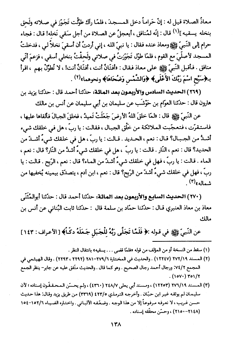 (٢٧٠) الحديث السابع والأربعون بعد المائة: حدّثنا أحمد قال: حدّثنا أبو المُثَنّى معاذ بن معاذ العنبري قال: حدّثنا حمّاد بن سلمة قال: حدّثنا ثابت البُناني عن أنس بن مالك: