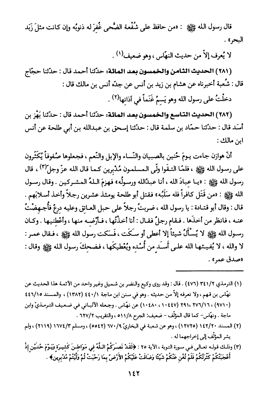 (١) الترمذي ٢/ ٣٤١ (٤٧٦). قال: وقد روى وكيع والنضر بن شميل وغير واحد من الأئمة هذا الحديث عن نهّاس بن قهم، ولا نعرفه إلّا من حديثه. وهو في سنن ابن ماجة ١/ ٤٤٠ (١٣٨٢)، والمسند ١٥/ ٤٤٦ (٩٧١٠)، ١٦/ ٢٧٦، ٢٩١ (١٠٤٤٧، ١٠٤٨٠) عن نهّاس. وجعله الألباني في ضعيف الترمذيّ وابن ماجة. ونهّاس -كما قال المؤلّف- ضعيف: الجرح ٨/ ٥١١، والتقريب ٢/ ٦٢٧.