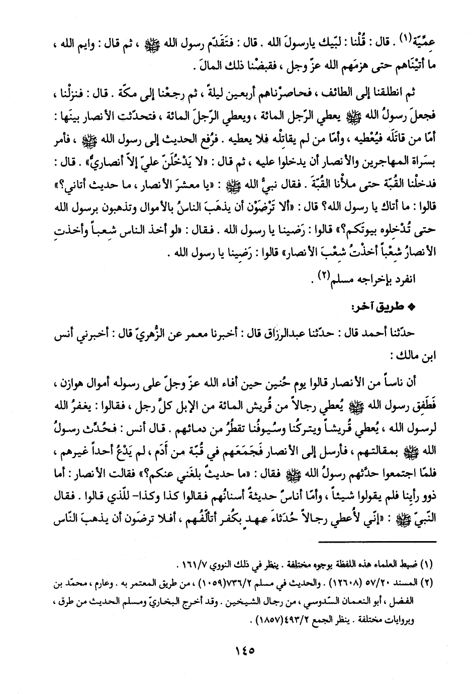 أن ناسًا من الأنصار قالوا يوم حُنين حين أفاء اللَّه عزّ وجلّ على رسوله أموال هوازن، فَطَفِق رسول اللَّه -صلى اللَّه عليه وسلم- يُعطي رجالًا من قُريش المائة من الإبل كلَّ رجل، فقالوا: يغفرُ اللَّه لرسول اللَّه، يُعطي قُريشًا ويتركُنا وسُيوفُنا تقطُرُ من دمائهم. قال أنس: فحُدِّث رسولُ اللَّه -صلى اللَّه عليه وسلم- بمقالتهم، فأرسل إلى الأنصار فَجَمَعَهم في قُبّة من أَدَم، لم يَدْعُ أحدًا غيرهم، فلمّا اجتمعوا حدَّثهم رسولُ اللَّه -صلى اللَّه عليه وسلم- فقال: "ما حديثٌ بلغَني عنكم؟ " فقالت الأنصار: أما ذوو رأينا فلم يقولوا شيئًا، وأمّا أناسٌ حديثةٌ أسنانُهم فقالوا كذا وكذا - للّذي قالوا. فقال النّبيّ -صلى اللَّه عليه وسلم-: "إنّي لأُعطي رجالًا حُدَثاءَ عهدٍ بكُفر أتألّفُهم، أفلا ترضَون أن يذهبَ النّاس