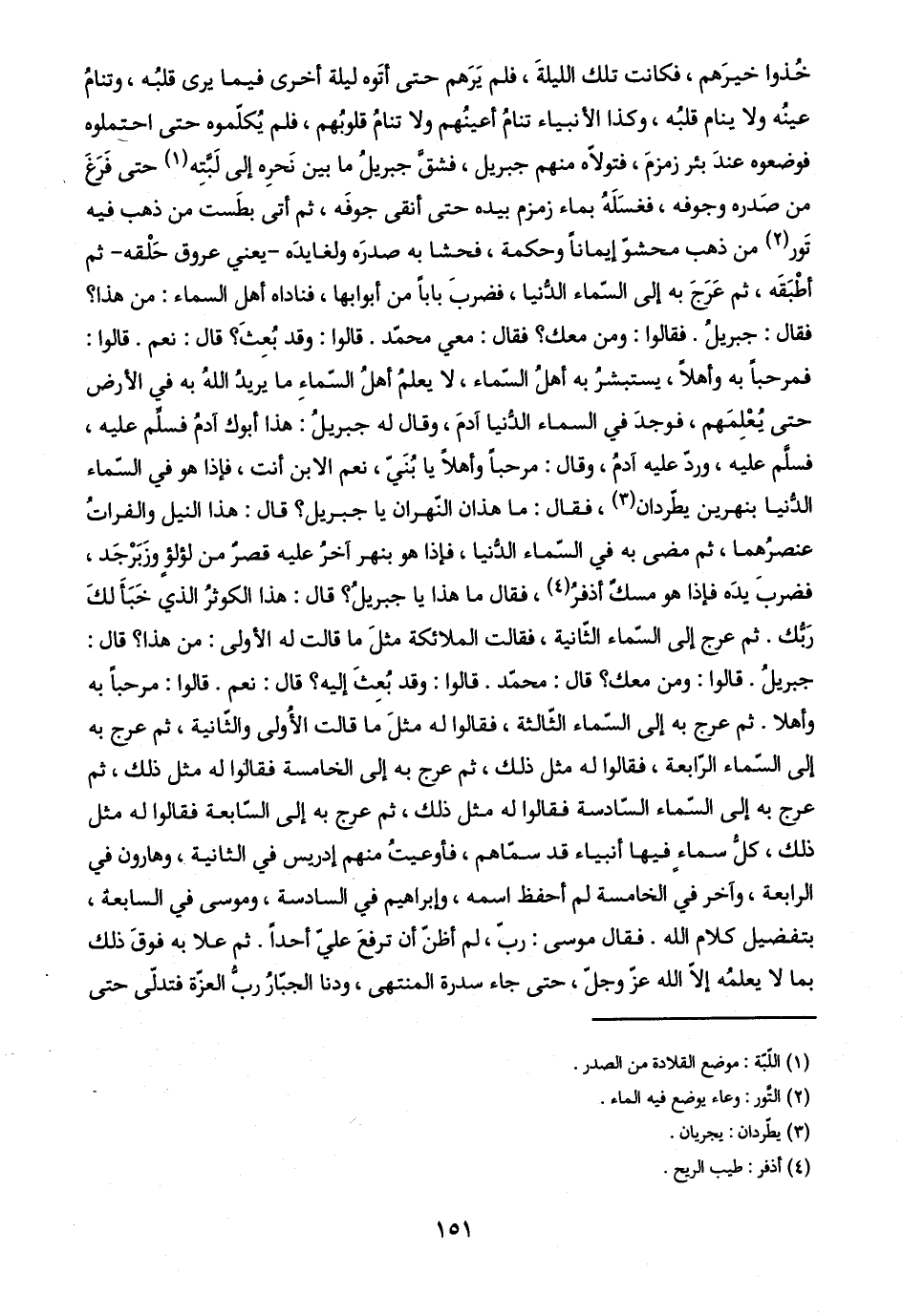 خُذوا خيرَهم، فكانت تلك الليلةَ، فلم يَرَهم حتى أتَوه ليلة أخرى فيما يرى قلبُه، وتنامُ عينُه ولا ينام قلبُه، وكذا الأنبياء تنامُ أعينُهم ولا تنامُ قلوبُهم، فلم يُكلّموه حتى احتملوه فوضعوه عندَ بئر زمزمَ، فتولّاه منهم جبريل، فشقَّ جبريلُ ما بين نَحرِه إلى لَبَّتِه (١) حتى فَرَغَ من صَدره وجوفه، فغسَلَهُ بماء زمزم بيده حتى أنقى جوفَه، ثم أتى بطَست من ذهب فيه تَور (٢) من ذهب محشوّ إيمانًا وحكمة، فحشا به صدرَه ولغايدَه -يعني عروق حَلْقه- ثم أطْبَقَه، ثم عَرَجَ به إلى السّماء الدُّنيا، فضربَ بابًا من أبوابها، فناداه أهل السماء: من هذا؟ فقال: جبريلُ. فقالوا: ومن معك؟ فقال: معي محمّد. قالوا: وقد بُعِثَ؟ قال: نعم. قالوا: فمرحبًا به وأهلًا، يستبشرُ به أهلُ السّماء، لا يعلمُ أهلُ السّماءِ ما يريدُ اللَّهُ به في الأرض حتى يُعْلِمَهم، فوجدَ في السماء الدُّنيا آدمَ، وقال له جبريلُ: هذا أبوك آدمُ فسلِّم عليه، فسلَّم عليه، وردّ عليه آدمُ، وقال: مرحبًا وأهلًا يا بُنَيّ، نعم الابن أنت، فإذا هو في السّماء الدُّنيا بنهرين يطّردان (٣)، فقال: ما هذان النّهران يا جبريل؟ قال: هذا النيل والفراتُ عنصرُهما، ثم مضى به في السّماء الدُّنيا، فإذا هو بنهر آخرُ عليه قصرٌ من لؤلؤٍ وزَبَرْجَد، فضربَ يدَه فإذا هو مسكٌ أذفرُ (٤)، فقال ما هذا يا جبريلُ؟ قال: هذا الكوثرُ الذي خَبَأَ لكَ رَبُّك. ثم عرج إلى السّماء الثّانية، فقالت الملائكة مثلَ ما قالت له الأولى: من هذا؟ قال: جبريلُ. قالوا: ومن معك؟ قال: محمّد. قالوا: وقد بُعِثَ إليه؟ قال: نعم. قالوا: مرحبًا به وأهلا. ثم عرج به إلى السّماء الثّالثة، فقالوا له مثلَ ما قالت الأُولى والثّانية، ثم عرج به إلى السّماء الرّابعة، فقالوا له مثل ذلك، ثم عرج به إلى الخامسة فقالوا له مثل ذلك، ثم عرج به إلى السّماء السّادسة فقالوا له مثل ذلك، ثم عرج به إلى السّابعة فقالوا له مثل ذلك، كلُّ سماءٍ فيها أنبياء قد سمّاهم، فأوعيتُ منهم إدريس في الثانية، وهارون في الرابعة، وآخر في الخامسة لم أحفظ اسمه، وإبراهيم في السادسة، وموسى في السابعة، بتفضيل كلام اللَّه. فقال موسى: ربّ، لم أظنّ أن ترفعَ عليّ أحدًا. ثم علا به فوقَ ذلك بما لا يعلمُه إلّا اللَّه عزّ وجلّ، حتى جاء سدرة المنتهى، ودنا الجبّارُ ربُّ العزّة فتدلّى حتى