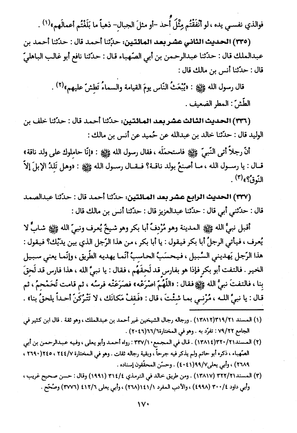 (٣٣٦) الحديث الثالث عشر بعد المائتين: حدّثنا أحمد قال: حدّثنا خلف بن الوليد قال: حدّثنا خالد بن عبد اللَّه عن حُميد عن أنس بن مالك: