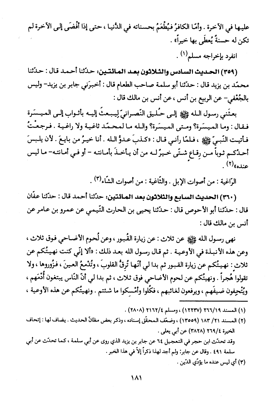 (٣٥٩) الحديث السادس والثلاثون بعد المائتين: حدّثنا أحمد قال: حدّثنا محمد بن يزيد قال: حدّثنا أبو سلمة صاحب الطعام قال: أخبرَني جابر بن يزيد -وليس بالجُعْفي- عن الربيع بن أنس، عن أنس بن مالك قال: