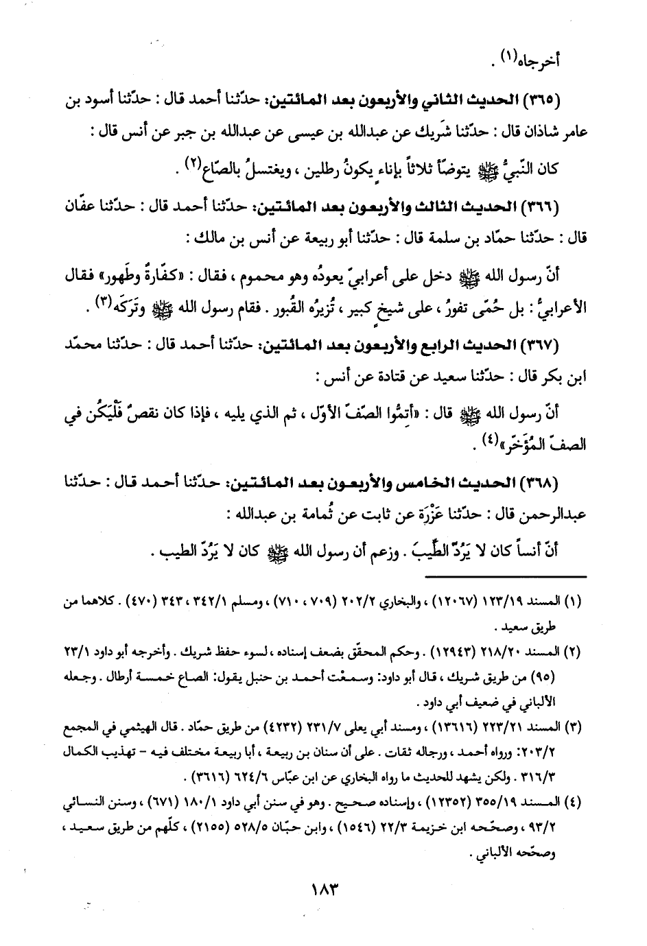 (٣٦٥) الحديث الثاني والأربعون بعد المائتين: حدّثنا أحمد قال: حدّثنا أسود بن عامر شاذان قال: حدّثنا شَريك عن عبد اللَّه بن عيسى عن عبد اللَّه بن جبر عن أنس قال: