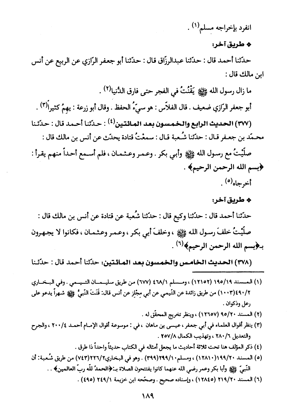 (٥) المسند ٢٠/ ١٩٩ (١٢٨١٠)، ومسلم ١٠/ ٢٩٩ (٣٩٩). وهو في البخاري ٢/ ٢٢٦ (٧٤٣) من طريق شُعبة: أن النّبيّ -صلى اللَّه عليه وسلم- وأبا بكر وعمر رضي اللَّه عنهما كانوا يفتتحون الصلاة بـ: {الْحَمْدُ لِلَّهِ رَبِّ الْعَالَمِينَ}. .