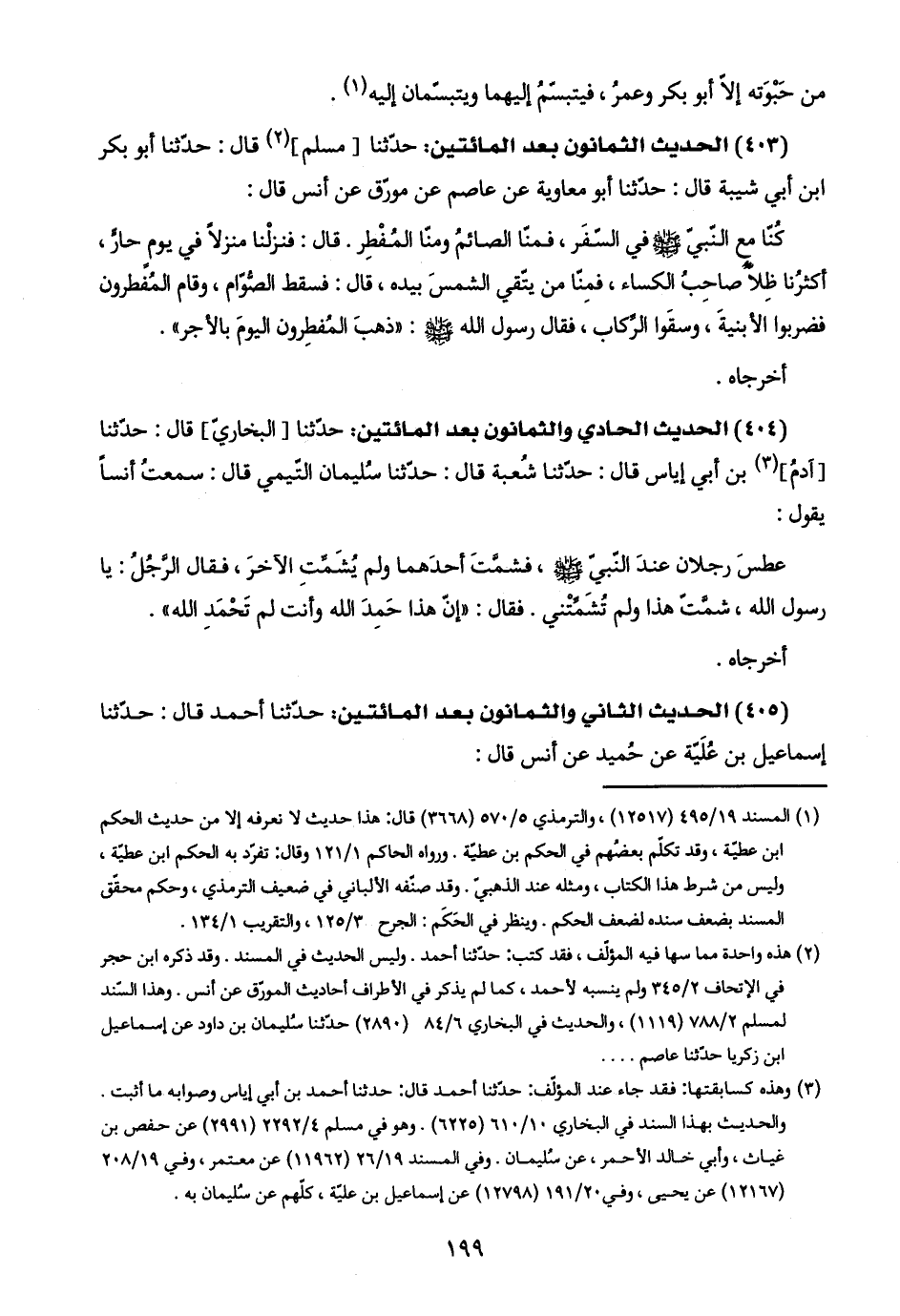 (٤٠٥) الحديث الثاني والثمانون بعد المائتين: حدّثنا أحمد قال: حدّثنا إسماعيل بن عُلَيَّة عن حُميد عن أنس قال:
