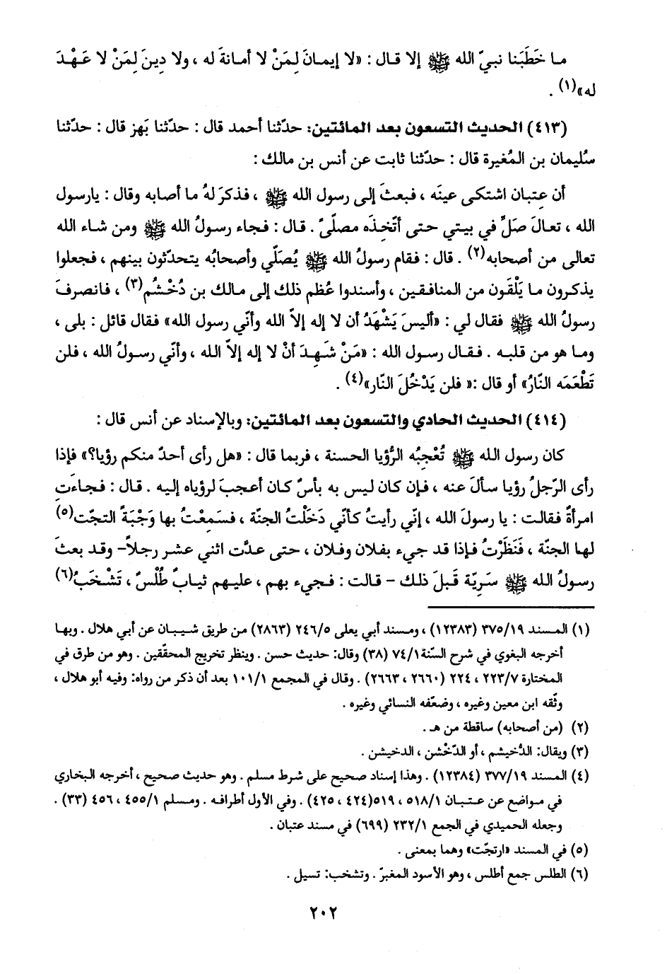 (٤١٣) الحديث التسعون بعد المائتين: حدّثنا أحمد قال: حدّثنا بَهز قال: حدّثنا سُليمان بن المُغيرة قال: حدّثنا ثابت عن أنس بن مالك: