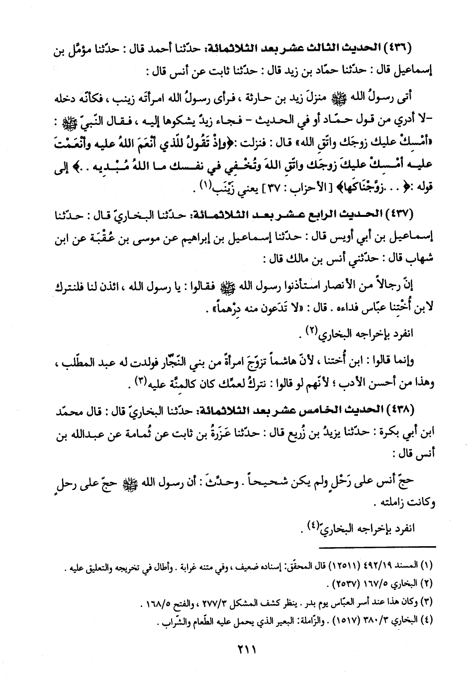 (٤٣٦) الحديث الثالث عشر بعد الثلاثمائة: حدّثنا أحمد قال: حدّثنا مؤمَّل بن إسماعيل قال: حدّثنا حمّاد بن زيد قال: حدّثنا ثابت عن أنس قال: