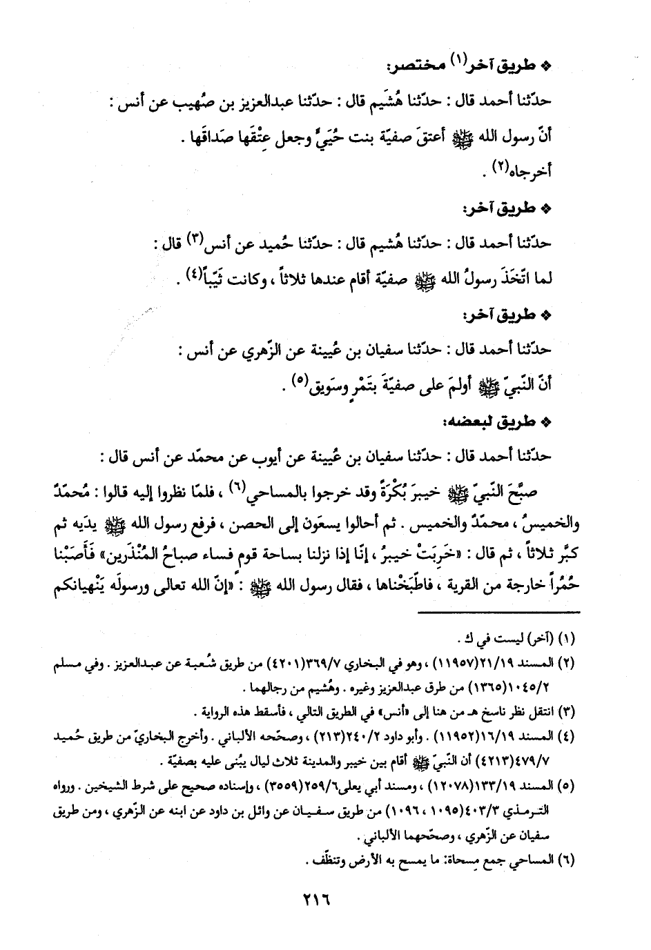 (٤) المسند ١٩/ ١٦ (١١٩٥٢). وأبو داود ٢/ ٢٤٠ (٢١٣)، وصحّحه الألباني. وأخرج البخاريّ من طريق حُميد ٧/ ٤٧٩ (٤٢١٣) أن النّبيّ -صلى اللَّه عليه وسلم- أقام بين خيبر والمدينة ثلاث ليال يبُنى عليه بصفيّة.
