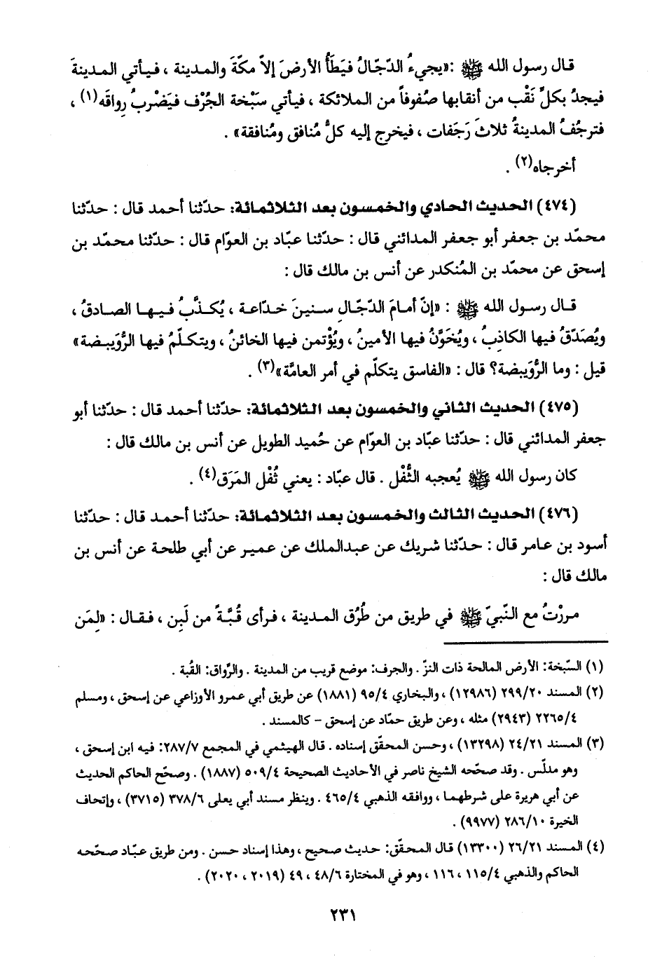 (٤٧٥) الحديث الثاني والخمسون بعد الثلاثمائة: حدّثنا أحمد قال: حدّثنا أبو جعفر المدائني قال: حدّثنا عبّاد بن العوّام عن حُميد الطويل عن أنس بن مالك قال:
