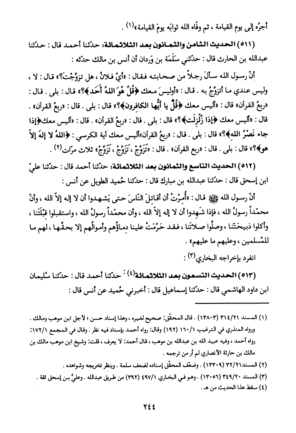 (٥١١) الحديث الثامن والثمانون بعد الثلاثمائة: حدّثنا أحمد قال: حدّثنا عبد اللَّه بن الحارث قال: حدّثني سَلَمَة بن وَردان أن أنس بن مالك حدّثه: