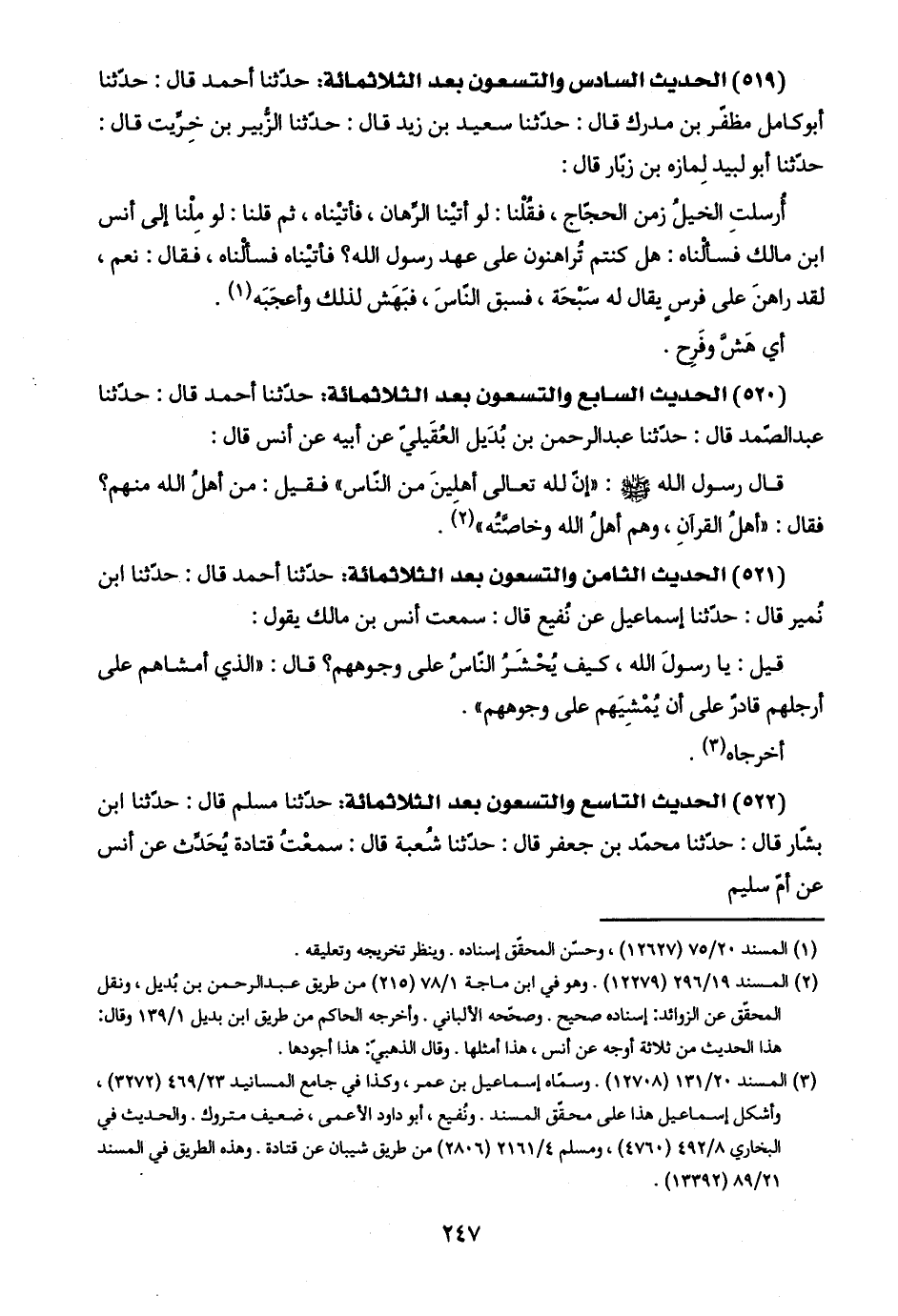 (٥٢١) الحديث الثامن والتسعون بعد الثلاثمائة: حدّثنا أحمد قال: حدّثنا ابن نُمير قال: حدّثنا إسماعيل عن نُفيع قال: سمعت أنس بن مالك يقول: