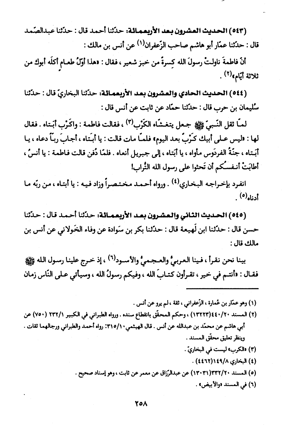 (٥٤٣) الحديث العشرون بعد الأربعمائة: حدّثنا أحمد قال: حدّثنا عبد الصّمد قال: حدّثنا عمّار أبو هاشم صاحب الزّعفران (١) عن أنس بن مالك: