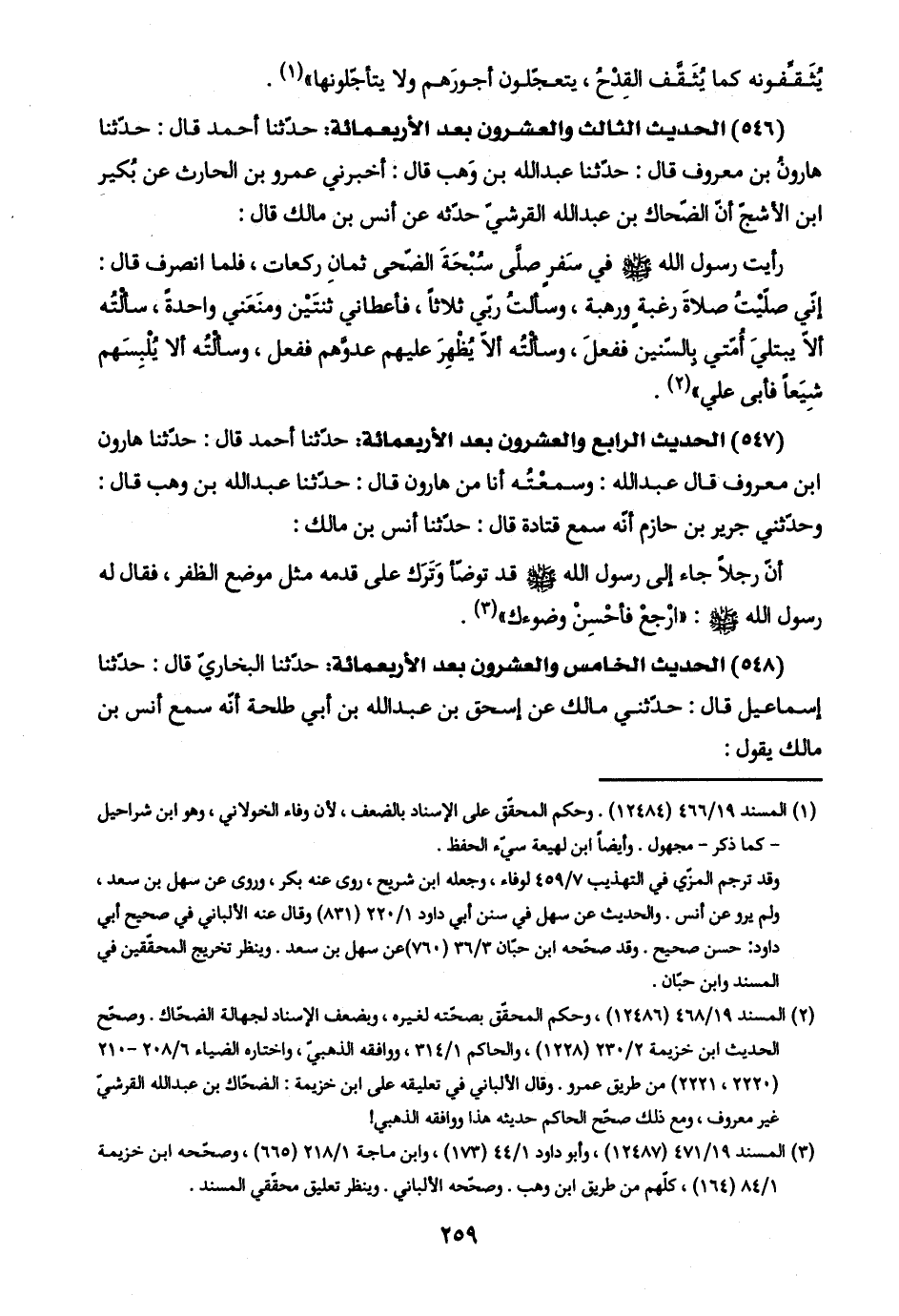 (٥٤٦) الحديث الثالث والعشرون بعد الأربعمائة: حدّثنا أحمد قال: حدّثنا هارونُ بن معروف قال: حدّثنا عبد اللَّه بن وَهب قال: أخبرني عمرو بن الحارث عن بُكير ابن الأشجّ أنّ الضّحاك بن عبد اللَّه القرشيّ حدّثه عن أنس بن مالك قال: