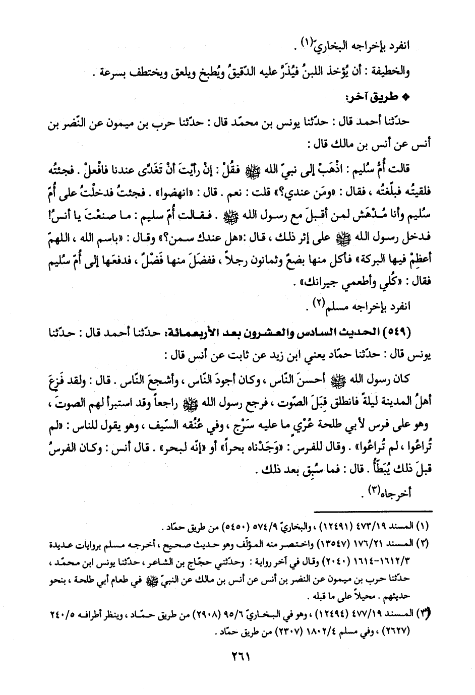 (٢) المسند ٢١/ ١٧٦ (١٣٥٤٧) واختصر منه المؤلّف وهو حديث صحيح، أخرجه مسلم بروايات عديدة ٣/ ١٦١٢ - ١٦١٤ (٢٠٤٠) وقال في آخر رواية: وحدّثني حجّاج بن الشاعر، حدّثنا يونس ابن محمّد، حدّثنا حرب بن ميمون عن النضر بن أنس عن أنس بن مالك عن النّبيّ -صلى اللَّه عليه وسلم- في طعام أبي طلحة، بنحو حديثهم. محيلًا على ما قبله.