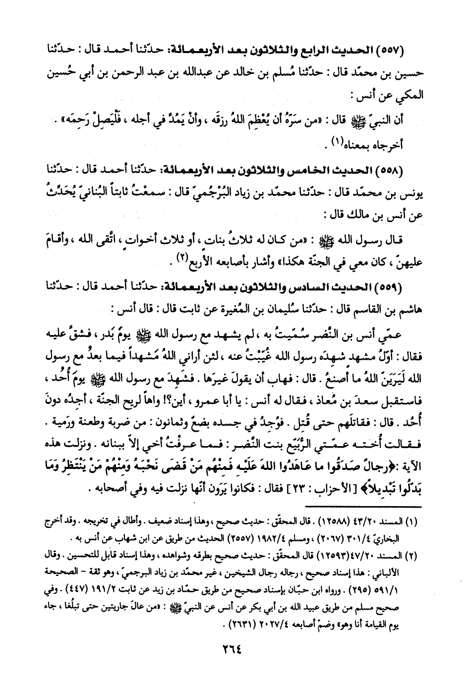 عمّي أنس بن النَّضر سُمّيتُ به، لم يشهد مع رسول اللَّه -صلى اللَّه عليه وسلم- يوم بَدر، فشقَّ عليه فقال: أوّلُ مشهدٍ شهِدَه رسول اللَّه غُيَبْتُ عنه، لئن أراني اللَّهُ مَشهدًا فيما بعدُ مع رسول اللَّه لَيَرَيَنّ اللَّهُ ما أصنعُ. قال: فهاب أن يقولَ غيرَها. فشَهِدَ مع رسول اللَّه -صلى اللَّه عليه وسلم- يومَ أُحُد، فاستقبل سعدَ بن مُعاذ، فقال له أنس: يا أبا عمرو، أين؟ ! واهًا لريح الجنّة، أجِدُه دونَ أُحُد. قال: فقاتلَهم حتى قُتِل. فوُجِدُ في جسده بضعٌ وثمانون: من ضربة وطعنة ورَمية. فقالت أُخته عمّتي الرُّبَيّع بنت النَّضر: فما عرفْتُ أخي إلّا ببنانه. ونزلت هذه الآية: {رِجَالٌ صَدَقُوا مَا عَاهَدُوا اللَّهَ عَلَيْهِ فَمِنْهُمْ مَنْ قَضَى نَحْبَهُ وَمِنْهُمْ مَنْ يَنْتَظِرُ وَمَا بَدَّلُوا تَبْدِيلًا} [الأحزاب: ٢٣] فقال: فكانوا يَرَون أنّها نزلت فيه وفي أصحابه.