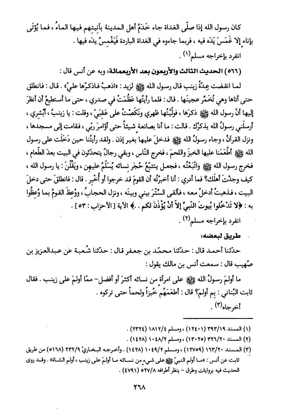 (٣) المسند ٢٠/ ١٦٣ (١٢٧٥٩)، ومسلم ٢/ ١٠٤٩ (١٤٢٨). وأخرجه البخاريّ ٩/ ٢٣٢ (٥١٦٨) من طريق ثابت عن أنس: "ما أولم النّبيّ -صلى اللَّه عليه وسلم- على شيءٍ من نسائه ما أولمَ على زينب، أولم الشاة". وقد روى الحديث فيه بروايات وطرق - ينظر أطرافه ٨/ ٥٢٧ (٤٧٩١).