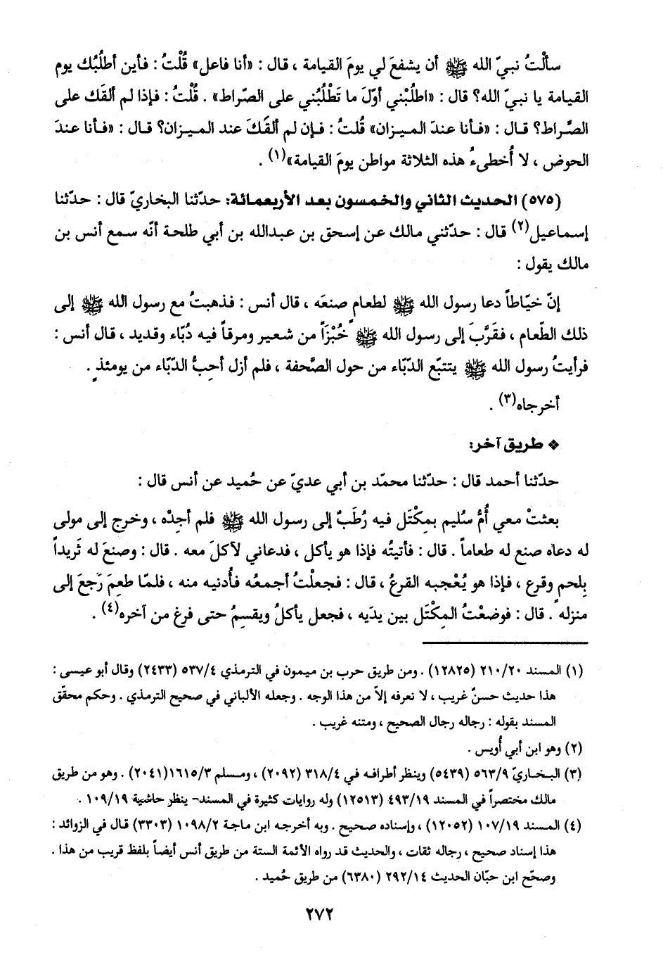 (٤) المسند ٧٩/ ١٠١ (١٢٠٥٢)، وإسناده صحيح. وبه أخرجه ابن ماجة ٢/ ١٠٩٨ (٣٣٠٣) قال في الزوائد: هذا إسناد صحيح، رجاله ثقات، والحديث قد رواه الأئمة الستة من طريق أنس أيضًا بلفظ قريب من هذا. وصحّح ابن حبّان الحديث ١٤/ ٢٩٢ (٦٣٨٠) من طريق حُميد.