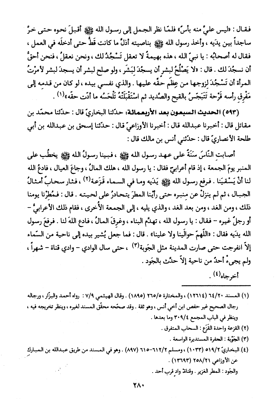 (٥٩٣) الحديث السبعون بعد الأربعمائة: حدّثنا البخاريّ قال: حدّثنا محمّد بن مقاتل قال: أخبرنا عبد اللَّه قال: أخبرنا الأوزاعيّ قال: حدّثنا إسحق بن عبد اللَّه بن أبي طلحة الأنصاريّ قال: حدّثني أنس بن مالك قال: