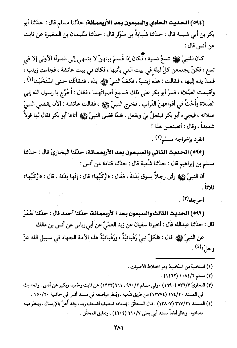 (٥٩٤) الحديث الحادي والسبعون بعد الأربعمائة: حدّثنا مسلم قال: حدّثنا أبو بكر بن أبي شيبة قال: حدّثنا شَبابةُ بن سَوّار قال: حدّثنا سُليمان بن المغيرة عن ثابت عن أنس قال: