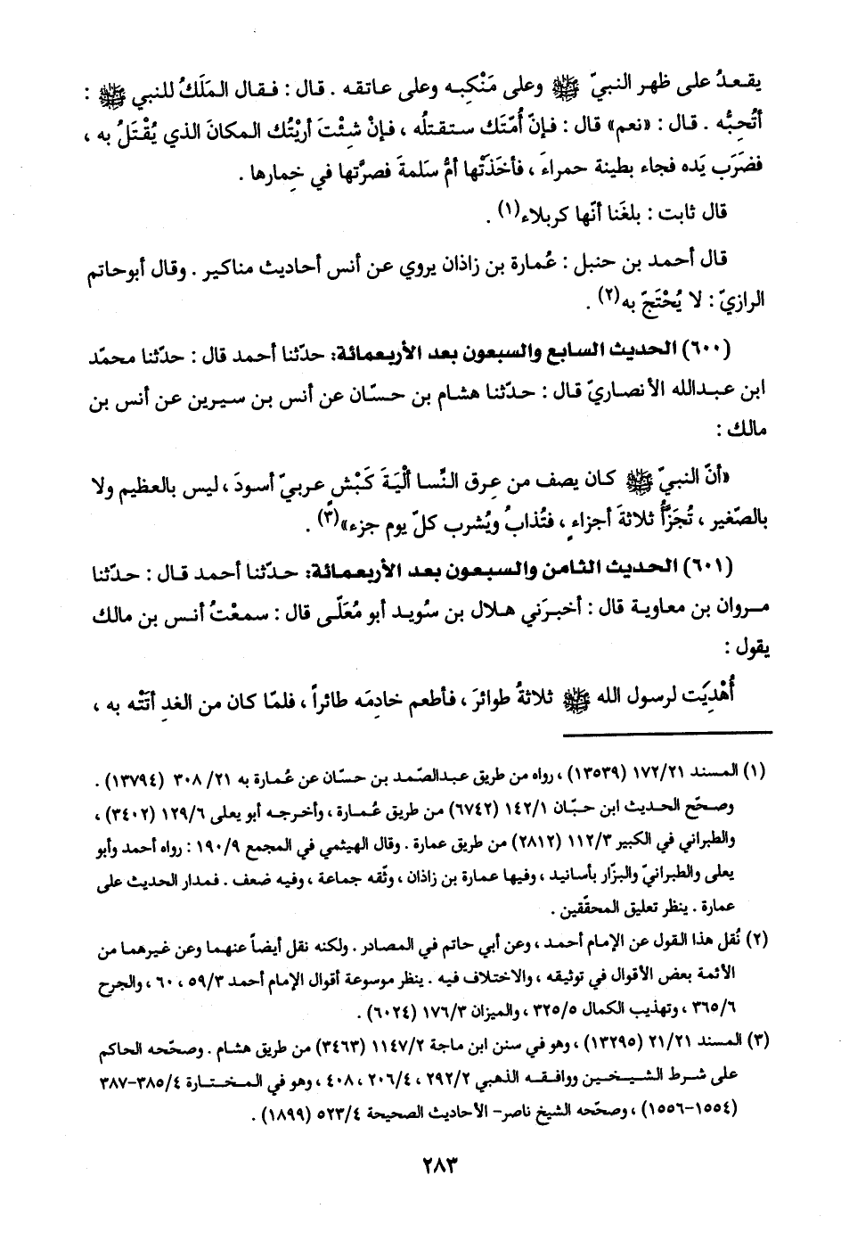 (٦٠٠) الحديث السابع والسبعون بعد الأربعمائة: حدّثنا أحمد قال: حدّثنا محمّد ابن عبد اللَّه الأنصاريّ قال: حدّثنا هشام بن حسّان عن أنس بن سيرين عن أنس بن مالك: