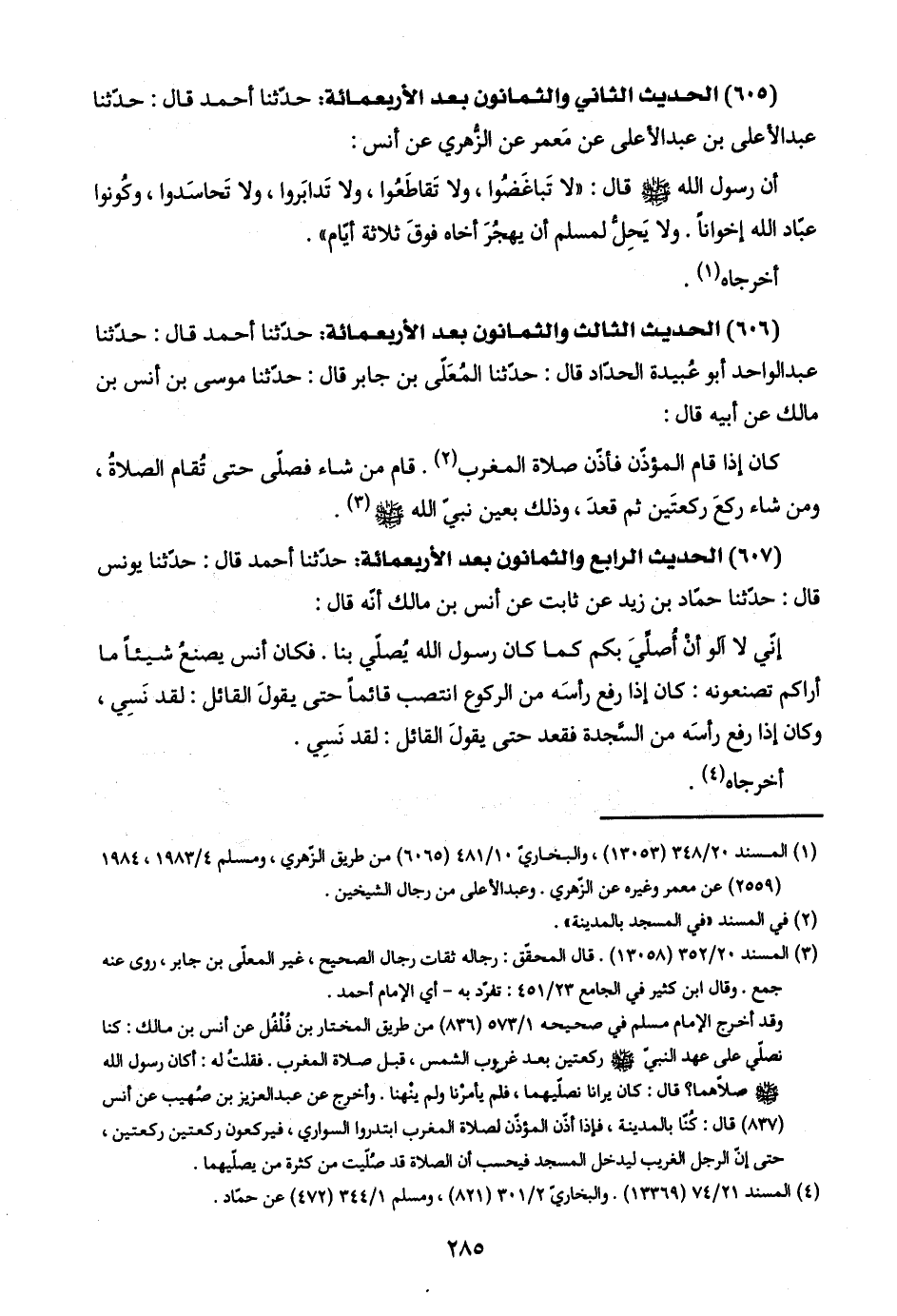 (٦٠٦) الحديث الثالث والثمانون بعد الأربعمائة: حدّثنا أحمد قال: حدّثنا عبد الواحد أبو عُبيدة الحدّاد قال: حدّثنا المُعَلّى بن جابر قال: حدّثنا موسى بن أنس بن مالك عن أبيه قال: