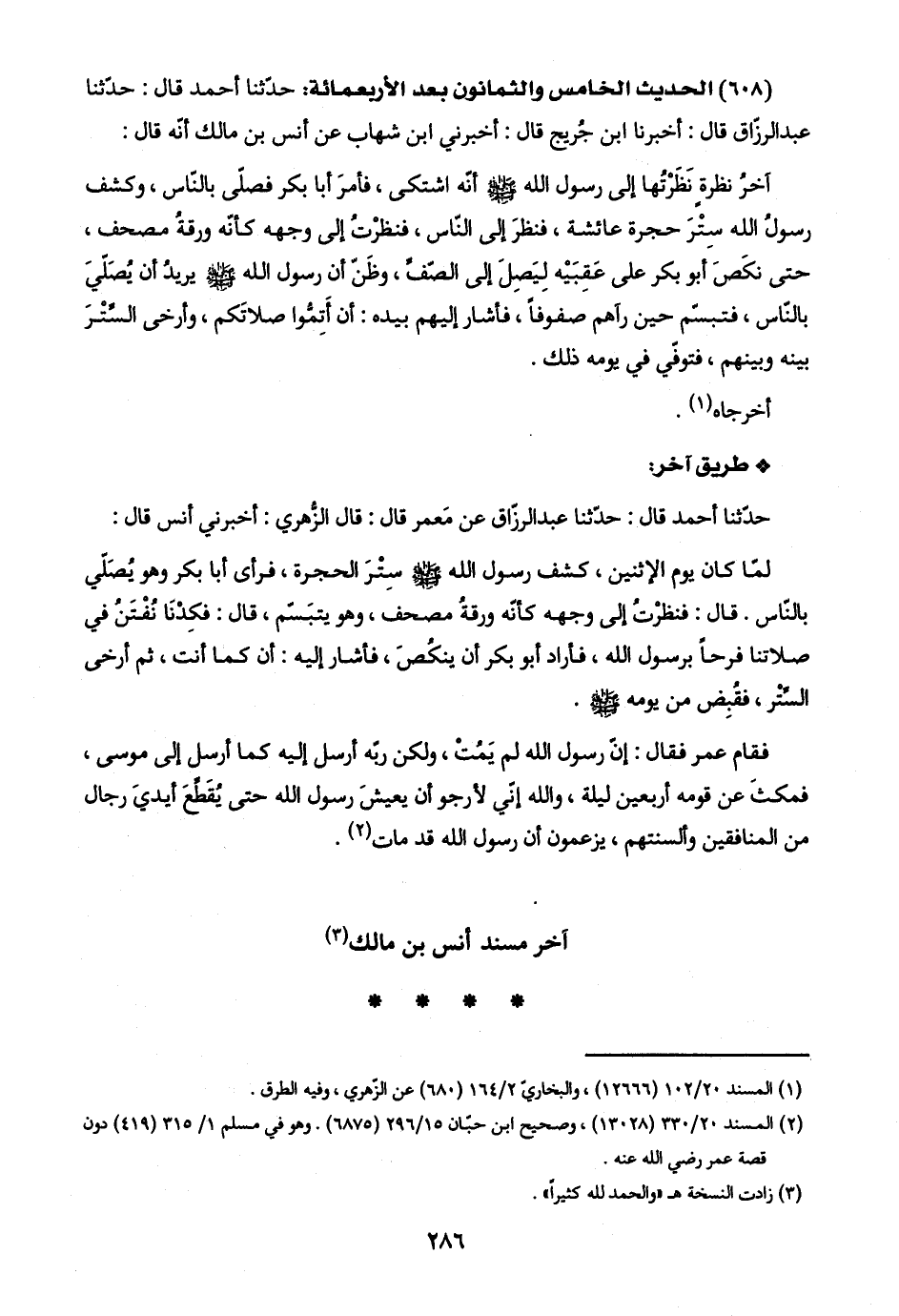 (٦٠٨) الحديث الخامس والثمانون بعد الأربعمائة: حدّثنا أحمد قال: حدّثنا عبد الرزّاق قال: أخبرنا ابن جُريج قال: أخبرني ابن شهاب عن أنس بن مالك أنّه قال:
