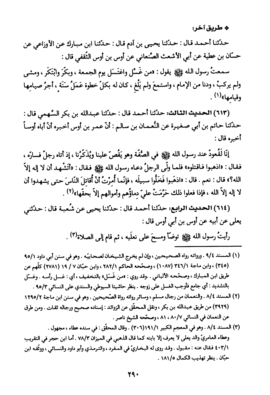 (٦١٣) الحديث الثالث: حدّثنا أحمد قال: حدّثنا عبد اللَّه بن بكر السَّهمي قال: حدّثنا حاتم بن أبي صغيرة عن النُّعمان بن سالم: أنّ عمر بن أوس أخبره أنّ أباه أوسًا أخبره قال:
