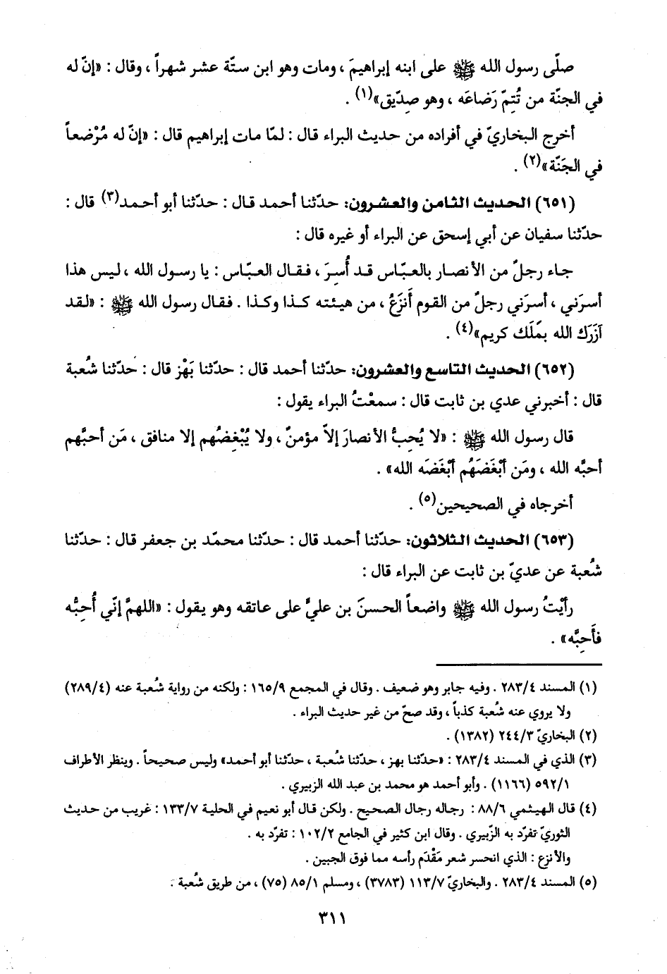 (٦٥٢) الحديث التاسع والعشرون: حدّثنا أحمد قال: حدّثنا بَهْز قال: حدّثنا شُعبة قال: أخبرني عدي بن ثابت قال: سمعْتُ البراء يقول: