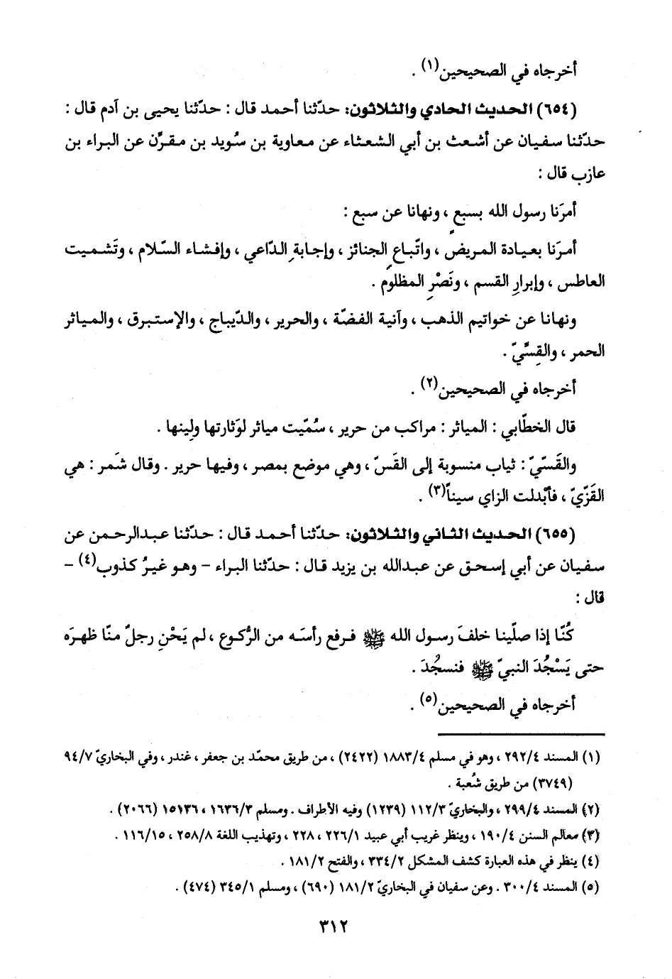 (٦٥٤) الحديث الحادي والثلاثون: حدّثنا أحمد قال: حدّثنا يحيى بن آدم قال: حدّثنا سفيان عن أشعث بن أبي الشعثاء عن معاوية بن سُويد بن مقرِّن عن البراء بن عازب قال: