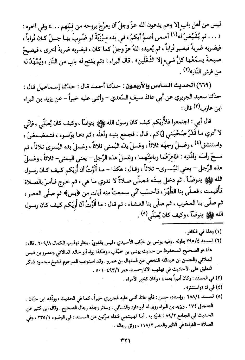 (٥) المسند ٤/ ٢٨٨. وإسناده حسن: فأبو عائذ أثنى عليه الجريري خيرًا، كما في الحديث، ووثّقه ابن حبّان. التعجيل ١٧٤. ويزيد بن البراء روى له أبو داود والنسائي. وسائر رجاله رجال الصحيح. وقال ابن كثير عن الحديث في الجامع ٢/ ٨٩: تفرّد به. أما الهيثمي فنقله مرّتين عن المسند: في الوضوء ١/ ٢٣٥، وفي الصلاة - القراءة في الظهر والعصر ٢/ ١١٨، ووثق رجاله.
