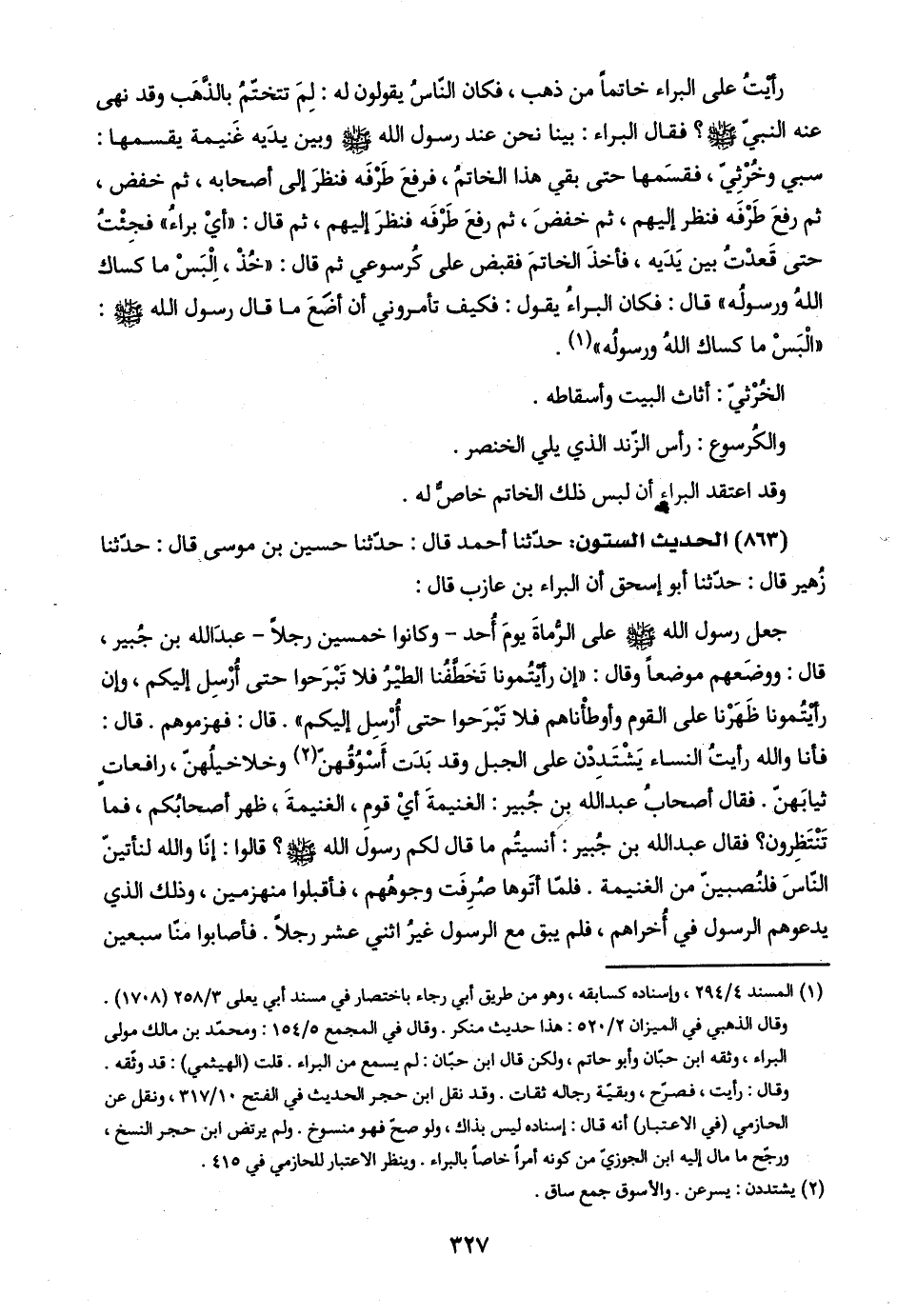 رأيْتُ على البراء خاتمًا من ذهب، فكان الناسُ يقولون له: لِمَ تتختّمُ بالذَّهَب وقد نهى عنه النّبيّ -صلى اللَّه عليه وسلم-؟ فقال البراء: بينا نحن عند رسول اللَّه -صلى اللَّه عليه وسلم- وبين يدَيه غَنيمة يقسمها: سبي وخُرْثِيّ، فقسَمها حتى بقي هذا الخاتمُ، فرفعَ طَرْفَه فنظرَ إلى أصحابه، ثم خفض، ثم رفعَ طَرْفَه فنظر إليهم، ثم خفضَ، ثم رفعَ طَرْفَه فنظرَ إليهم، ثم قال: "أيْ براءُ" فجِئْتُ حتى قَعدْتُ بين يَدَيه، فأخذَ الخاتمَ فقبض على كُرسوعي ثم قال: "خُذْ، الْبَسْ ما كساك اللَّهُ ورسولُه" قال: فكان البراءُ يقول: فكيف تأمروني أن أضَعَ ما قال رسول اللَّه -صلى اللَّه عليه وسلم-: "الْبَسْ ما كساك اللَّهُ ورسولُه" (١).