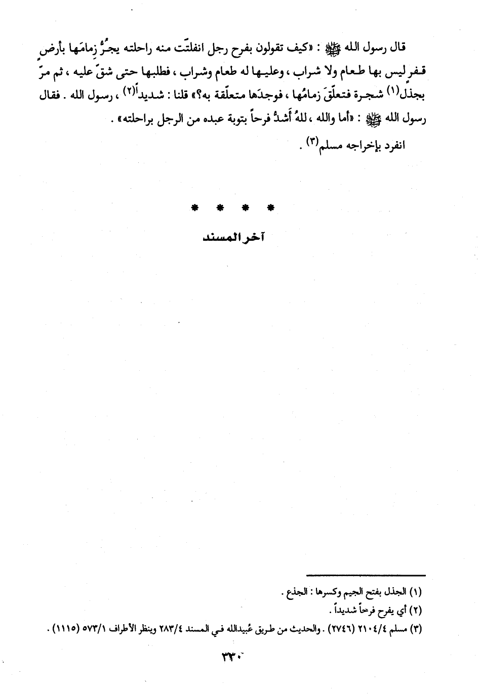قال رسول اللَّه -صلى اللَّه عليه وسلم-: "كيف تقولون بفرح رجل انفلتت منه راحلته يجُرُّ زِمامَها بأرضٍ قفرٍ ليس بها طعام ولا شراب، وعليها له طعام وشراب، فطلبها حتى شقّ عليه، ثم مرّ بجذل (١) شجرة فتعلّقَ زمامُها، فوجدَها متعلّقة به؟ " قلنا: شديدًا (٢)، رسول اللَّه. فقال رسول اللَّه -صلى اللَّه عليه وسلم-: "أما واللَّه، للَّهُ أَشدُّ فرحًا بتوبة عبده من الرجل براحلته".