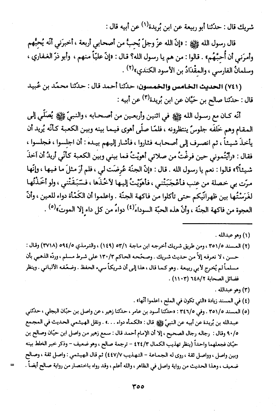 (٥) المسند ٥/ ٣٥١. وفي ٥/ ٣٤٦: "حدّثنا أسود بن عامر، حدّثنا زهير، عن واصل بن حبّان البجلي، حدّثني عبد اللَّه بن بُريدة عن أبيه عن النّبيّ -صلى اللَّه عليه وسلم- قال: "الكمأه دواء. . . ". ونقل الهيثمي الحديث في المجمع ٥/ ٩٠ وقال: رجاله رجال الصحيح، إلا أن الإمام أحمد قال: سمع زهير من واصل ابن حيّان وصالح بن حيّان فجعلهما واحدًا (ينظر تهذيب الكمال ٣/ ٤٢٤ - ترجمة صالح، وهو ضعيف- وذكر خبر الخلط بينه وبين واصل، وواصل ثقة، روى له الجماعة - التهذيب ٧/ ٤٤٧) ثم قال الهيثمي: واصل ثقة، وصالح ضعيف، وهذا الحديث من رواية واصل في الظاهر، واللَّه أعلم، وقد رواه باختصار من رواية صالح أيضًا.=