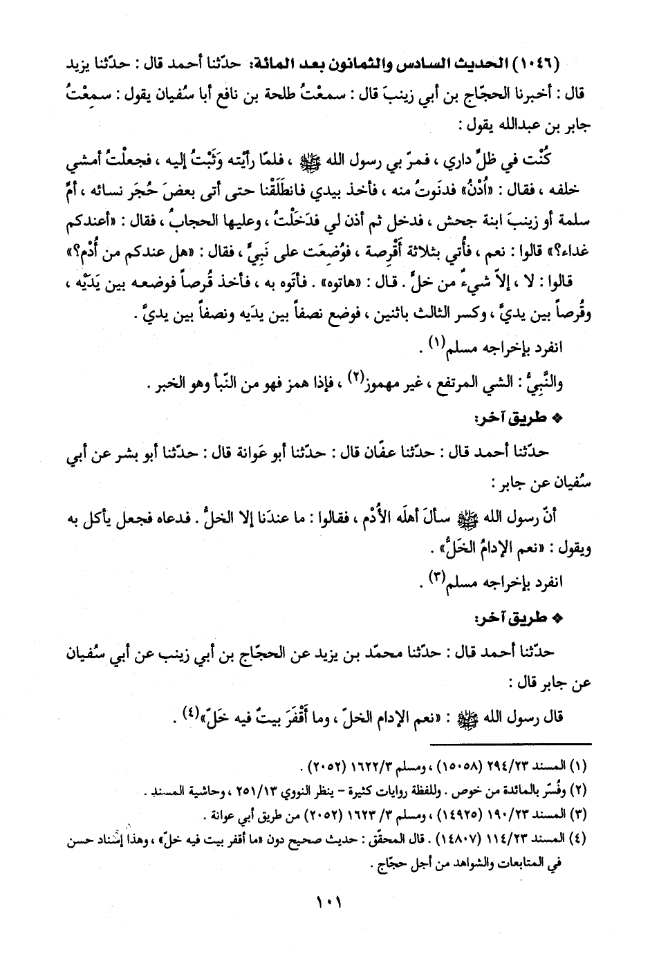 (٤) المسند ٢٣/ ١١٤ (١٤٨٠٧). قال المحقّق: حديث صحح دون "ما أقفر بيت فيه خلّ"، وهذا إسناد حسن في المتابعات والشواهد من أجل حجّاج.