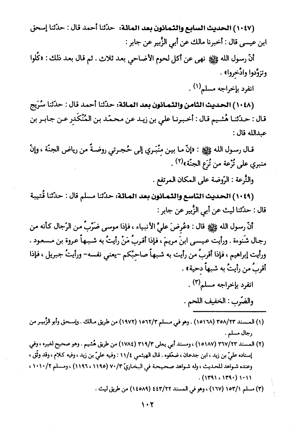 (١٠٤٨) الحديث الثامن والثمانون بعد المائة: حدّثنا أحمد قال: حدّثنا سُرَيج قال: حدّثنا هُشيم قال: أخبرنا علي بن زيد عن محمّد بن المُنْكَدِر عن جابر بن عبد اللَّه قال: