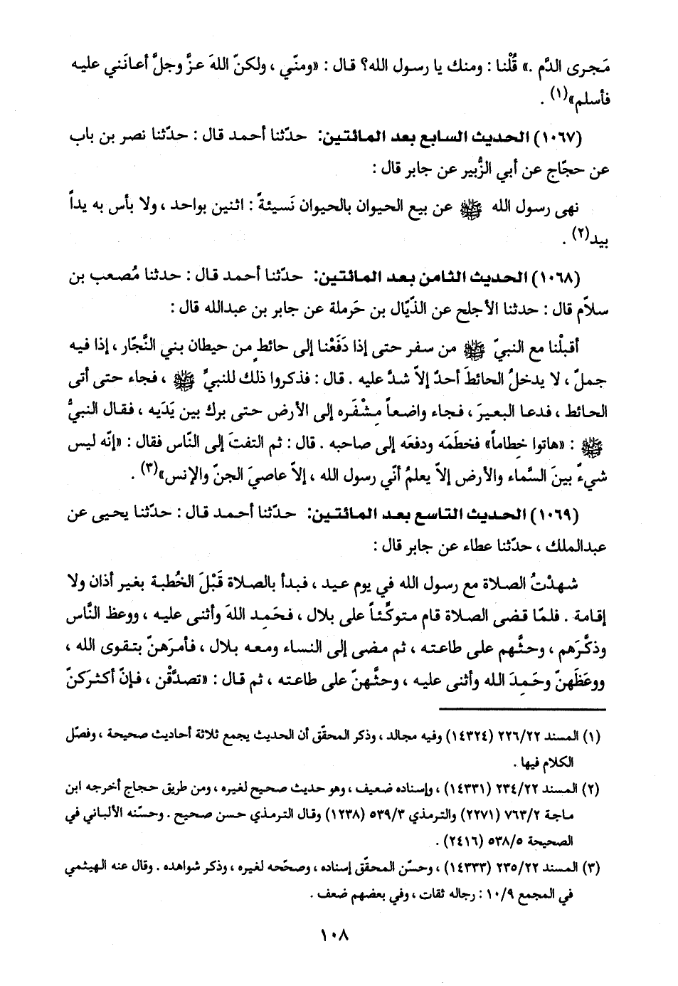 (١٠٦٨) الحديث الثامن بعد المائتين: حدّثنا أحمد قال: حدّثنا مُصعب بن سلّام قال: حدّثنا الأجلح عن الذّيّال بن حَرملة عن جابر بن عبد اللَّه قال: