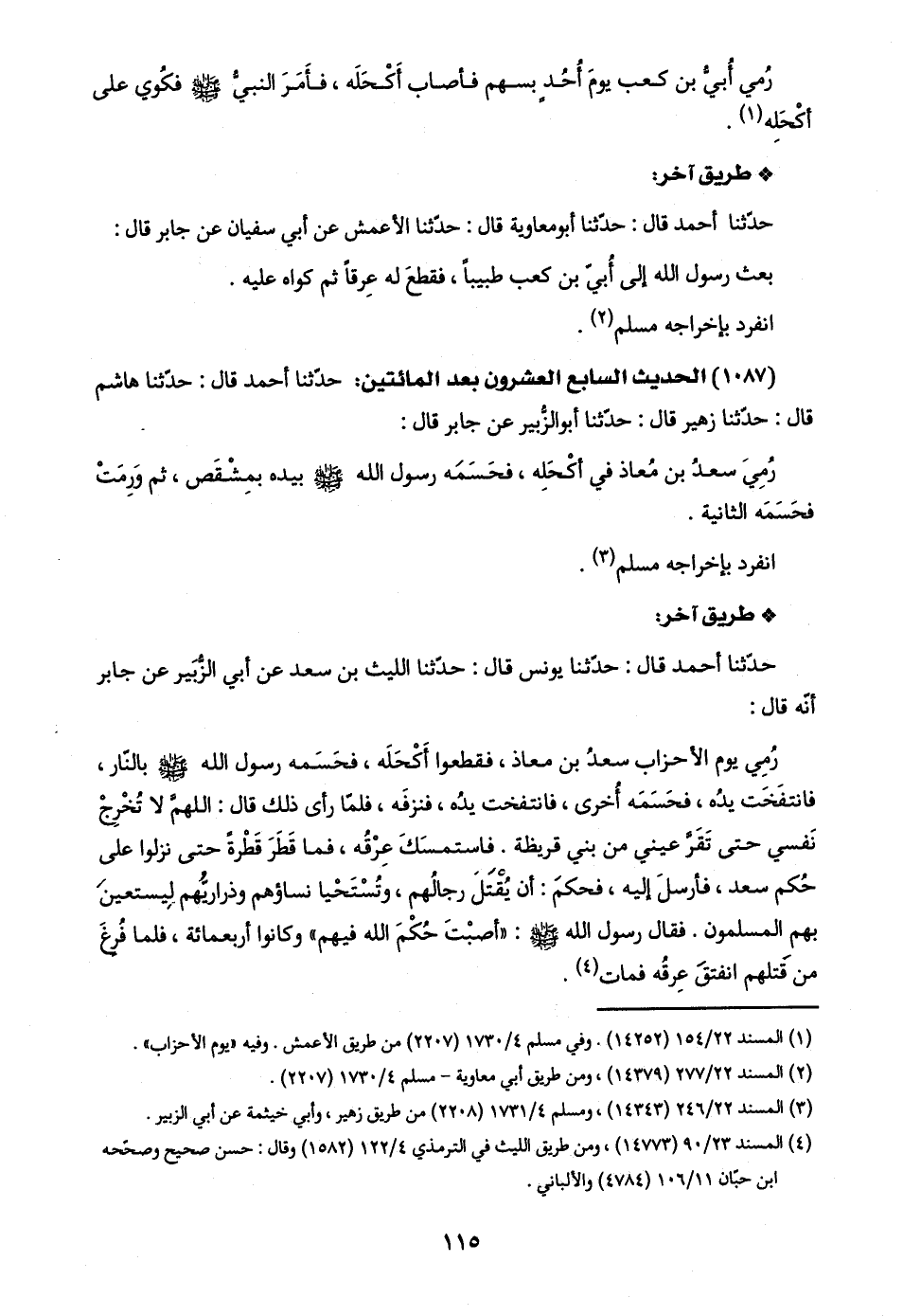 رُمِيَ سعدُ بن مُعاذ في أكْحَلِه، فحَسَمَه رسول اللَّه -صلى اللَّه عليه وسلم- بيده بمِشْقَص، ثم وَرِمَتْ فحَسَمَه الثانية.