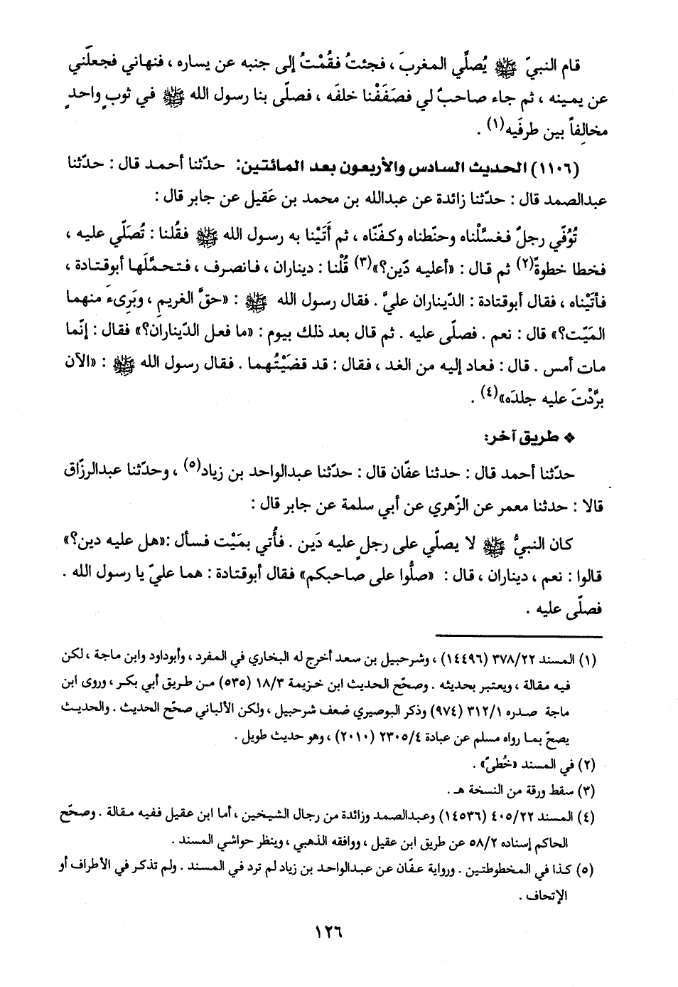 (١١٠٦) الحديث السادس والأربعون بعد المائتين: حدّثنا أحمد قال: حدّثنا عبد الصمد قال: حدّثنا زائدة عن عبد اللَّه بن محمد بن عَقيل عن جابر قال: