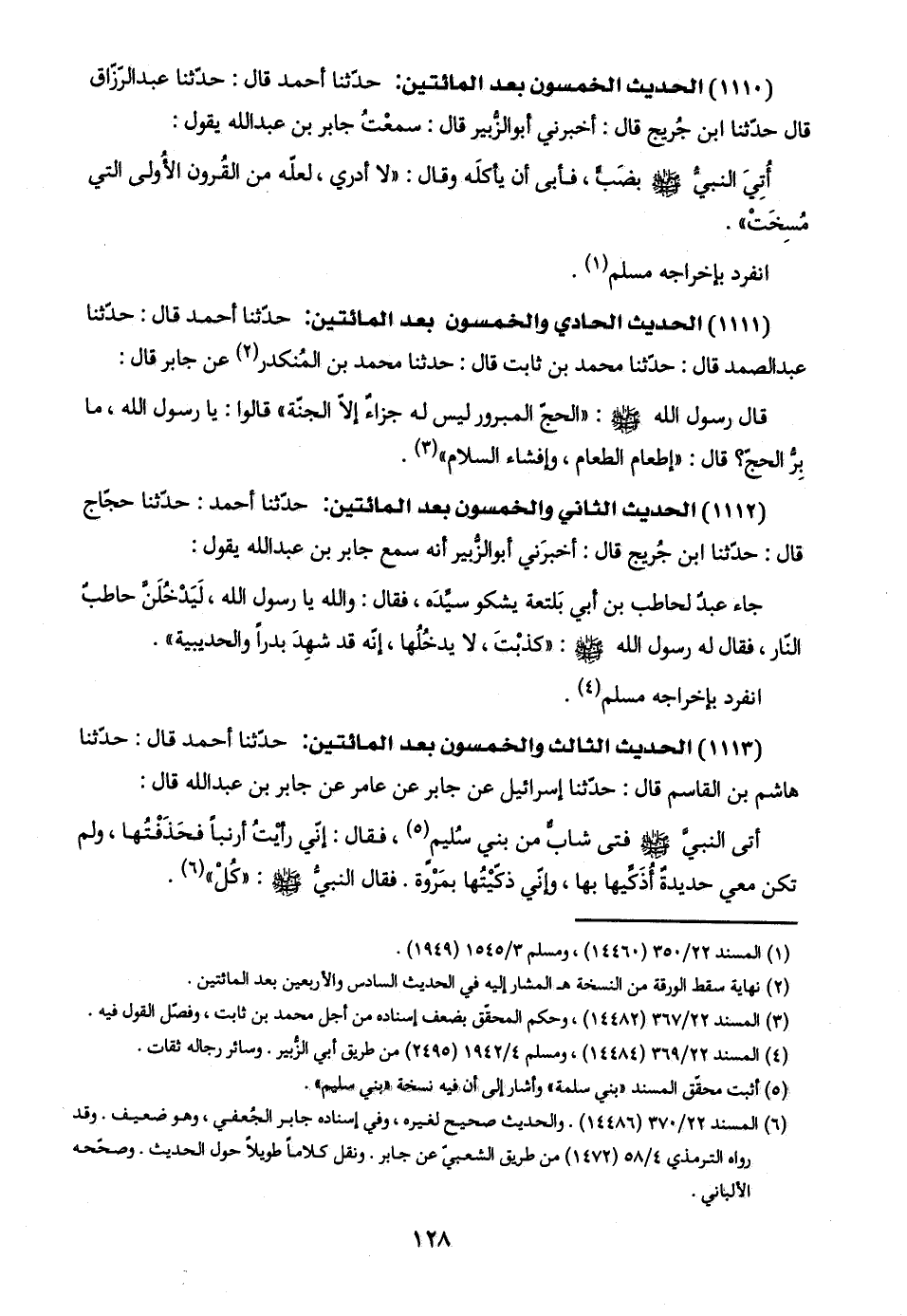 (١١١٠) الحديث الخمسون بعد المائتين: حدّثنا أحمد قال: حدّثنا عبد الرّزّاق قال حدّثنا ابن جُريج قال: أخبرني أبو الزُّبير قال: سمعْتُ جابر بن عبد اللَّه يقول: