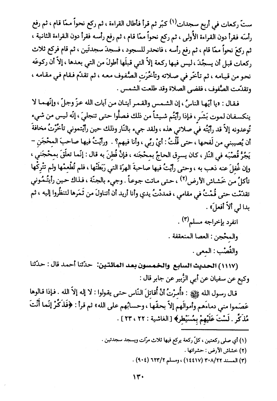 فقال: "يا أيّها الناسُ، إنّ الشمس والقمر آيتان من آيات اللَّه عزّ وجلّ، وإنّهما لا ينكسفان لموت بَشَرٍ، فإذا رأيْتُم شيئًا من ذلك فصلُّوا حتى تنجليَ، إنّه ليس من شيء تُوعدونه إلّا قد رأيْتُه في صلاتي هذه، ولقد جيء بالنّار وذلك حين رأيْتموني تأخَّرْتُ مخافةَ أن يُصيبني من لَفحها، حتى قُلْتُ: أيْ ربِّي، وأنا فيهم؟ . ورأيْتُ فيها صاحبَ المِحْجَنِ - يَجُرُّ قُصْبَه في النّار، كان يسرِق الحاجَّ بمِحْجَنه، فإنْ فُطِنَ به قال: إنّما تعلّقَ بمِحْجَني، وإن غُفِلَ عنه ذهب به، وحتى رأيْتُ فيها صاحبةَ الهرّة التي رَبَطَتْها، فلم تُطْعِمْها ولم تتْرِكْها تأكلُ من خَشاش الأرض (٢)، حتى ماتت جوعًا. وجيء بالجنّة، فذاك حين رأيتُمُوني تقدّمْت حتى قُمْتُ في مقامي، فمددْتُ يدي وأنا أريد أن أتناولَ من ثَمَرها لتنظُروا إليه، ثم بدا لي ألّا أفعلَ".