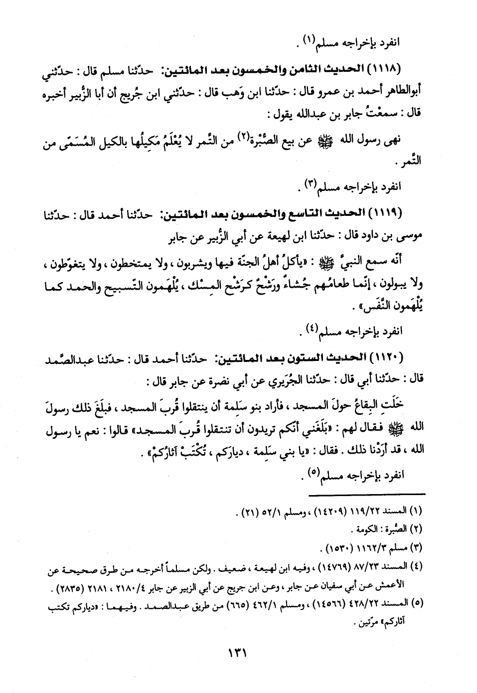 (١١١٨) الحديث الثامن والخمسون بعد المائتين: حدّثنا مسلم قال: حدّثني أبو الطاهر أحمد بن عمرو قال: حدّثنا ابن وَهب قال: حدّثني ابن جُريج أن أبا الزُّبير أخبره قال: سمعْتُ جابر بن عبد اللَّه يقول: