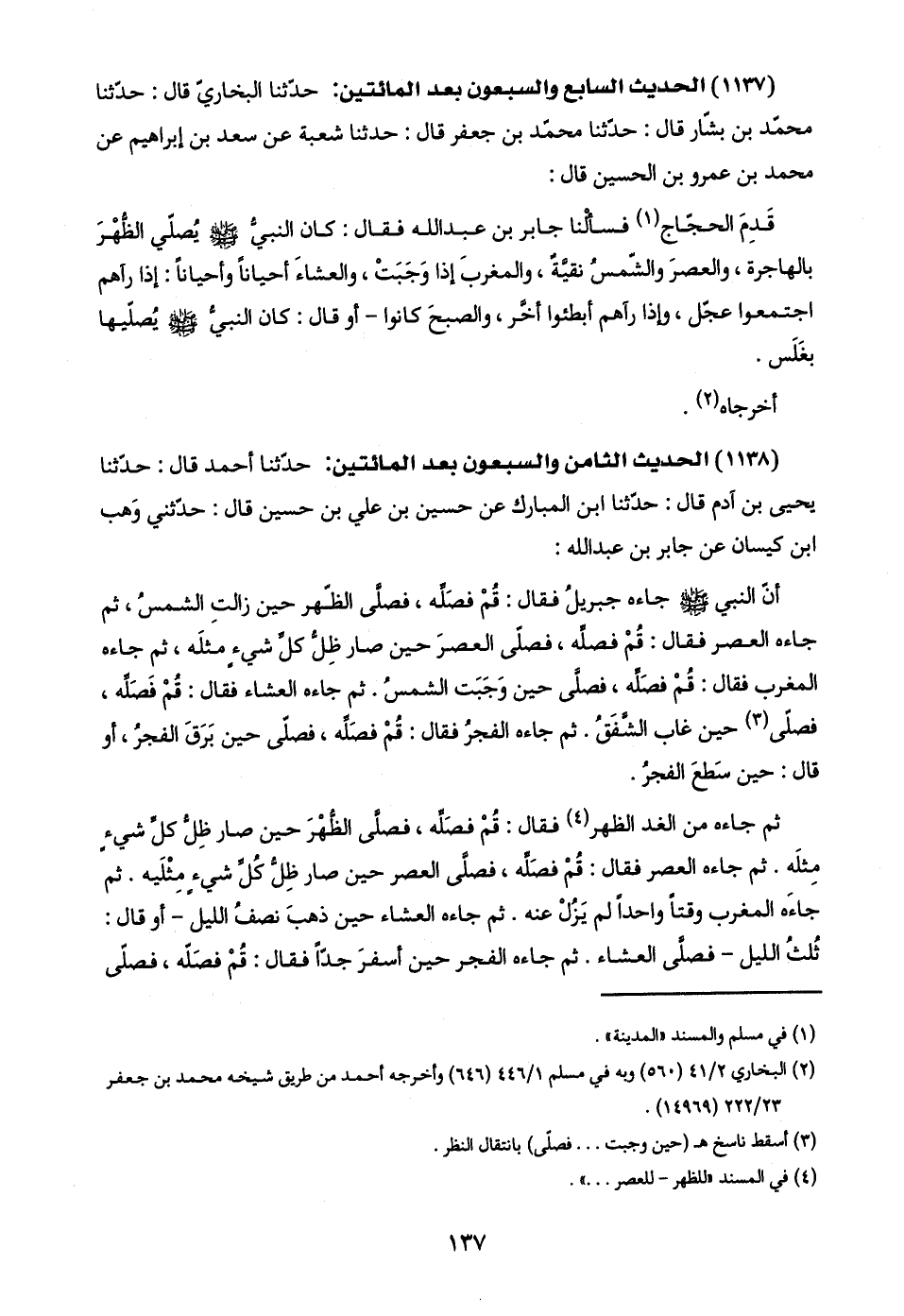 (١١٣٧) الحديث السابع والسبعون بعد المائتين: حدّثنا البخاريّ قال: حدّثنا محمّد بن بشّار قال: حدّثنا محمّد بن جعفر قال: حدّثنا شعبة عن سعد بن إبراهيم عن محمد بن عمرو بن الحسين قال: